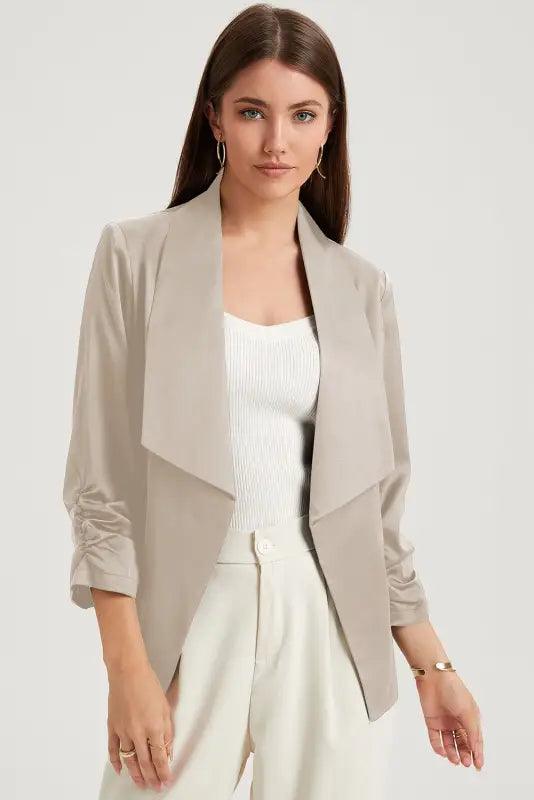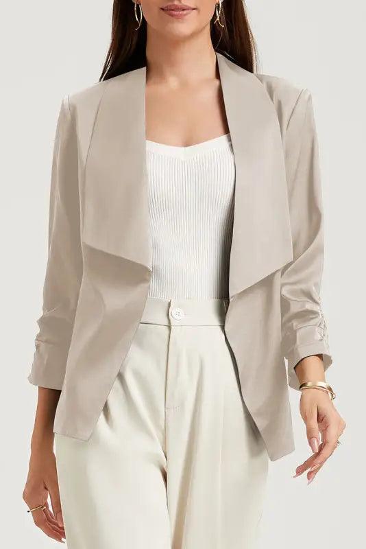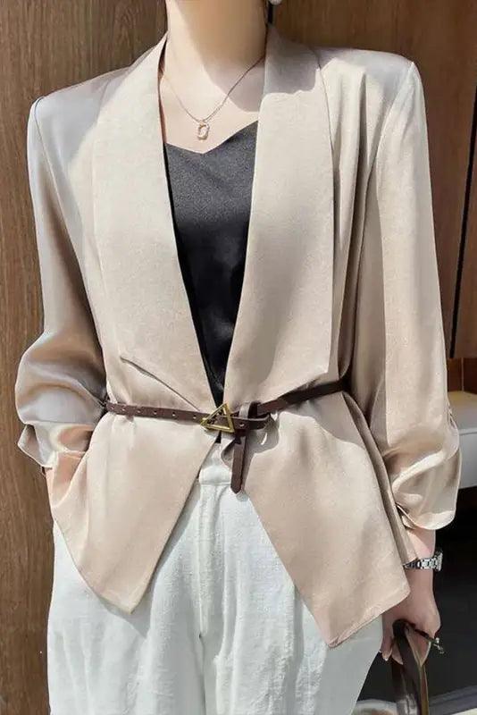 - This stylish blazer is a must-have for the office! Its long sleeves and lapel collar provide a timeless elegance that will never go out of style. The luxurious satin fabric will make you look sophisticated and graceful. Complete the look with a pair of pants and heels – stunning!