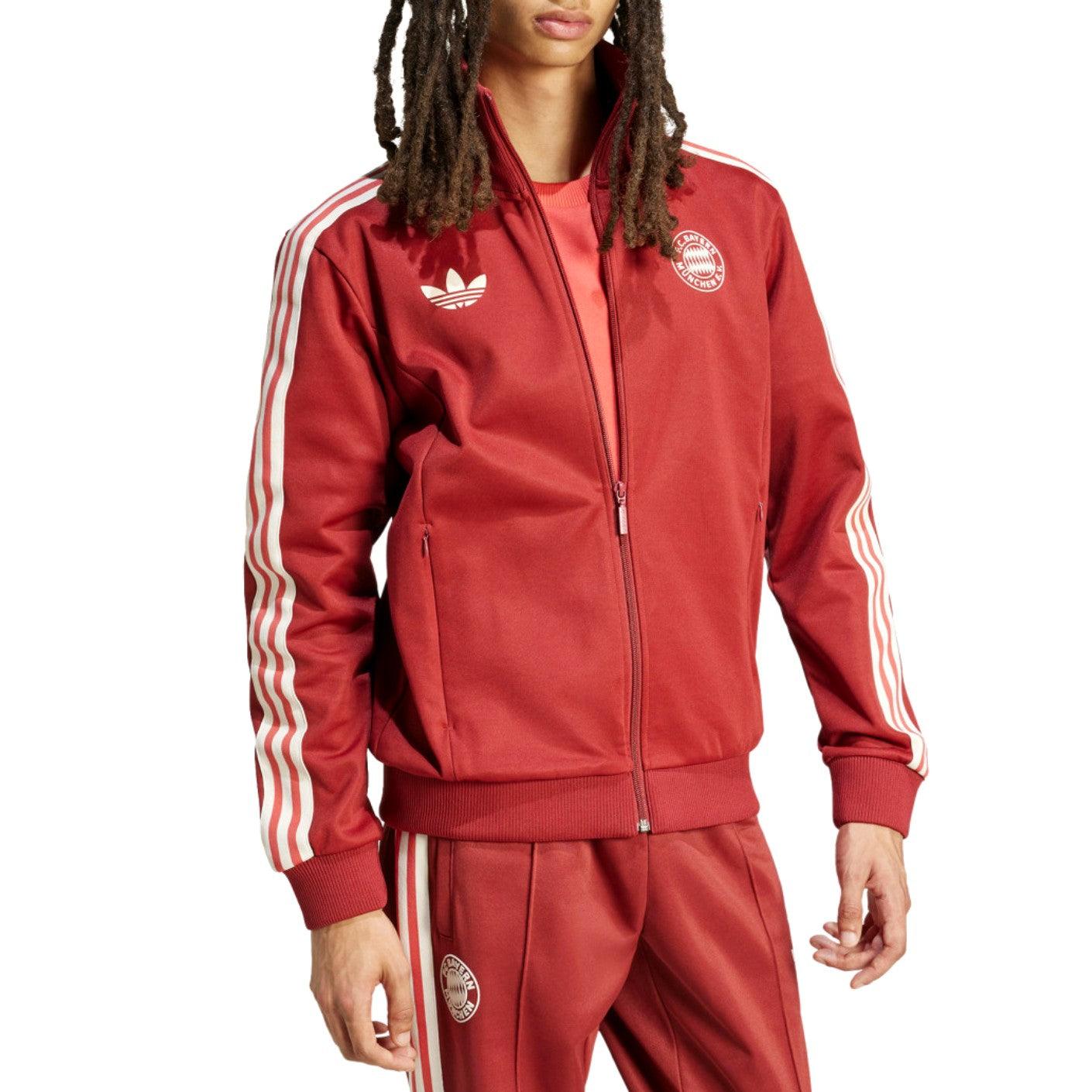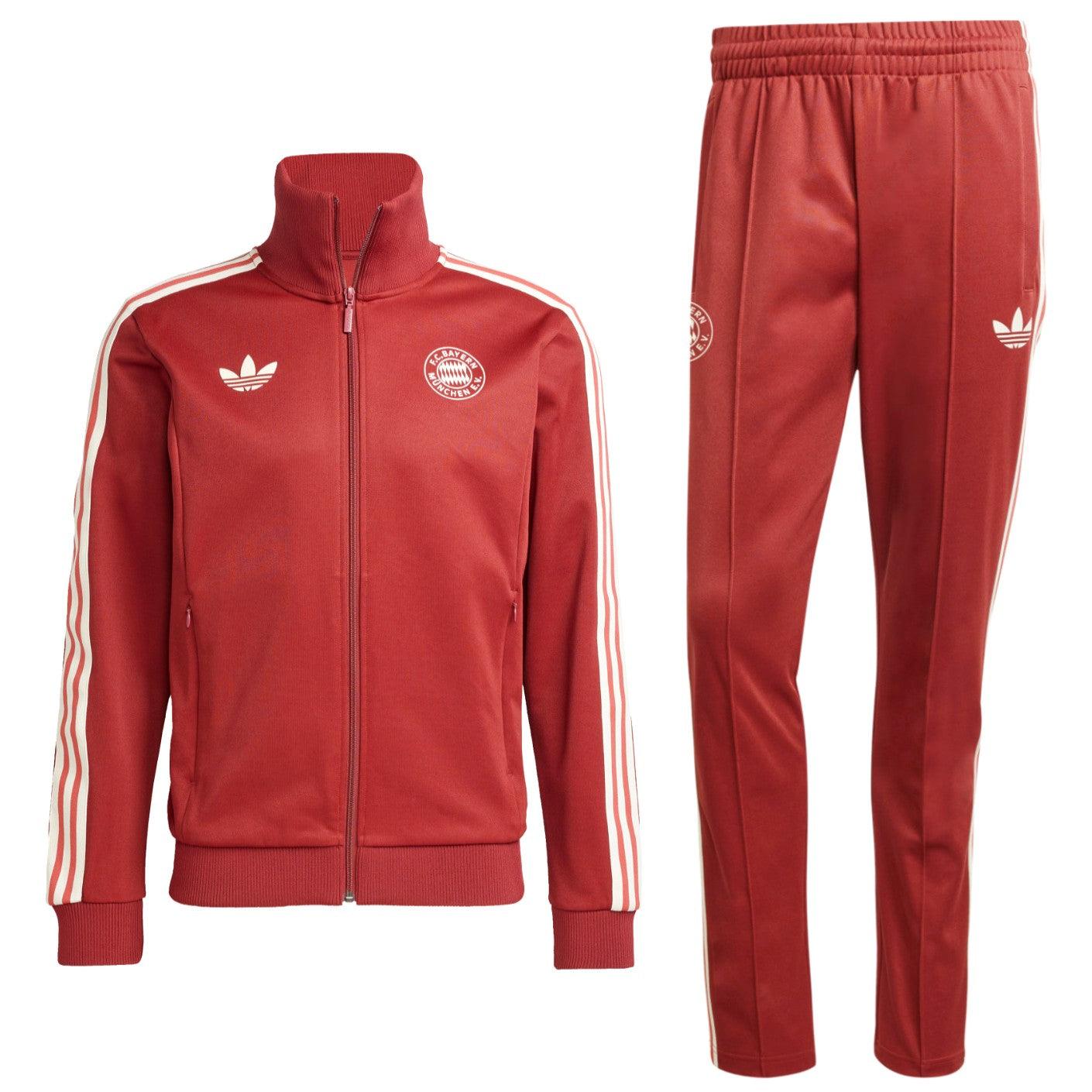 Authentic Bayern Munich casual presentation track set, Adidas Originals version, for german and international season 2025, designed by technical sponsor Adidas. This stunning tracksuit features red full zip track top and matching pants, both made out of 52% cotton and 48% polyester.