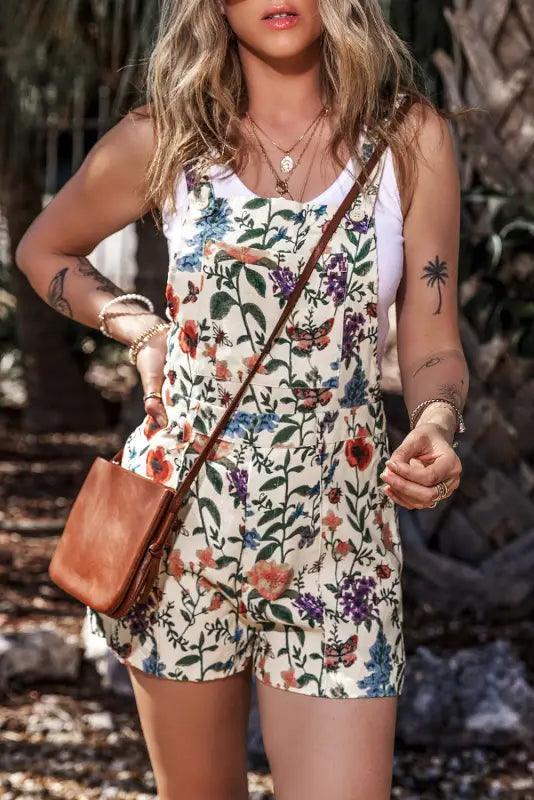 Be effortlessly chic in our Beige Floral Bib Open Back Romper! This romper features a playful floral bib design and an open back for a touch of sass. Perfect for any summer occasion, this romper will keep you cool and stylish all season long. (No serious fashion moments here!)