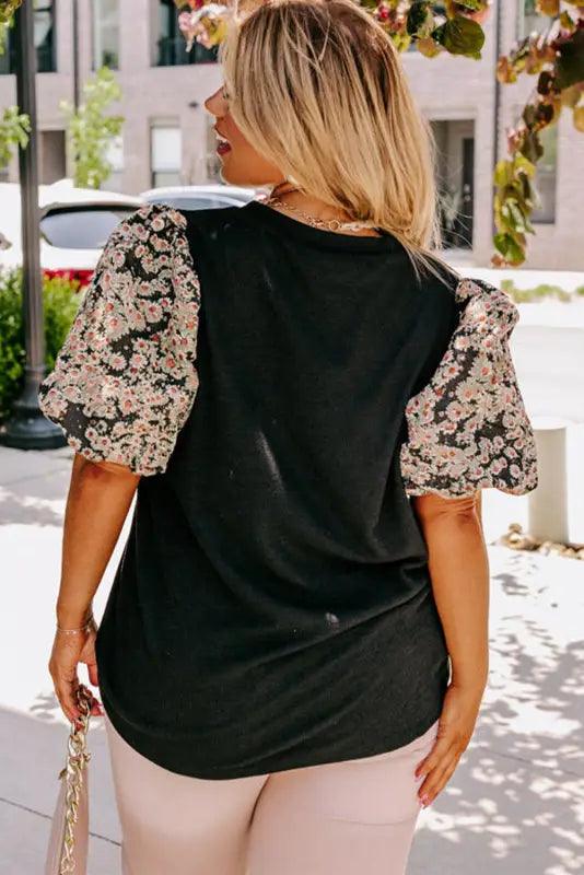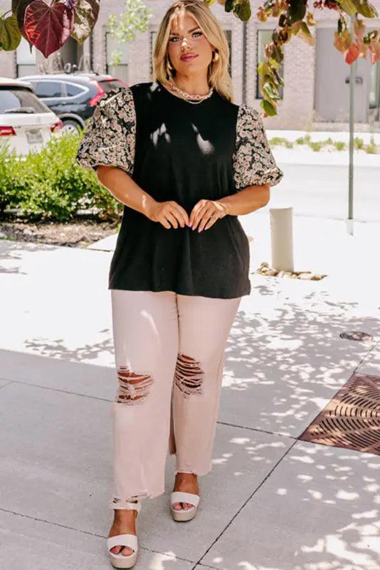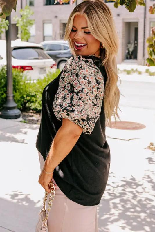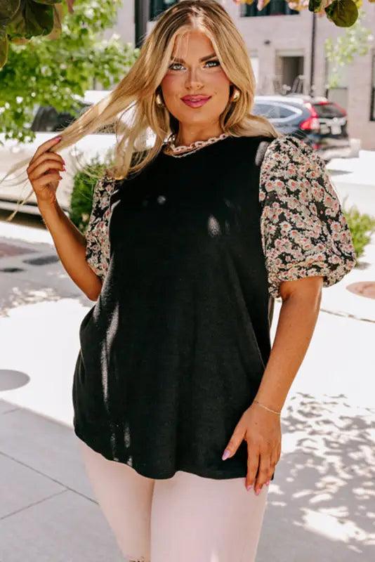 Black Daisy Printed Short Bubble Sleeve Plus Size Tunic Top