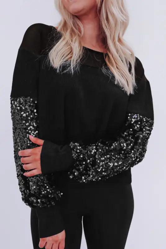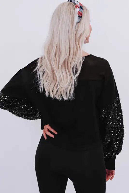 - Get ready to sparkle and shine in our Black Sequin Patchwork Lantern Sleeve Blouse!