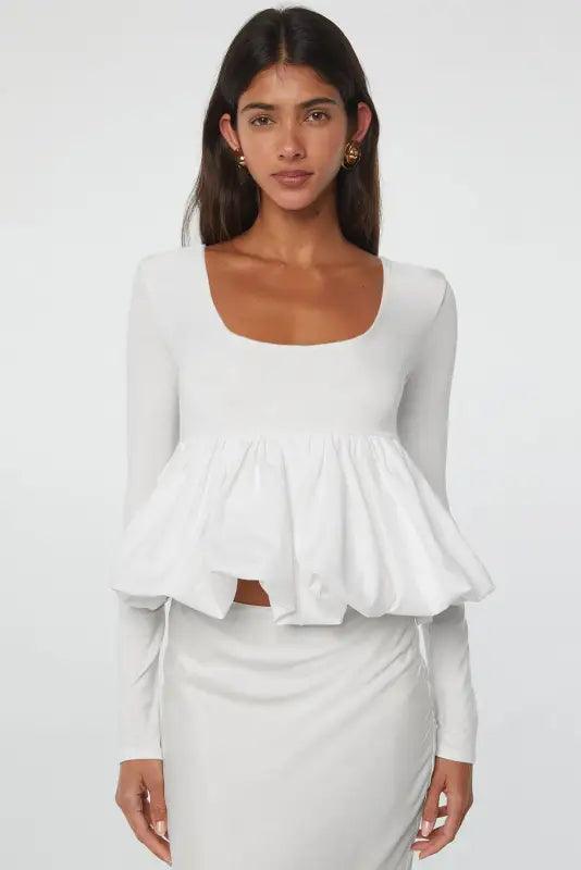 Indulge in luxury with our exquisite Bubble Hem Top. This elegant piece features a unique bubble hem design that adds a touch of sophistication to any outfit. Made with the finest materials, it will elevate your style to the next level. Perfect for any occasion, this top is a must-have for your wardrobe.