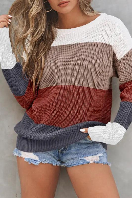 Embrace the cozy comfort and bold style of our Color-Block Knit Pullover Sweater. This must-have piece features a unique color-block design, perfect for making a statement. Crafted with soft, high-quality knit material, you’ll stay warm and stylish all season long. Elevate your wardrobe with this eye-catching sweater.