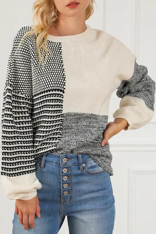 - This neutral color-block sweater features a stylish and versatile look that effortlessly pairs with any outfit