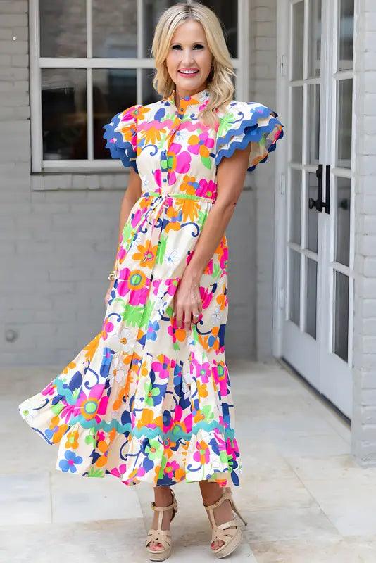 Floral Maxi Dress – Ricrac Trim Flutter Sleeve