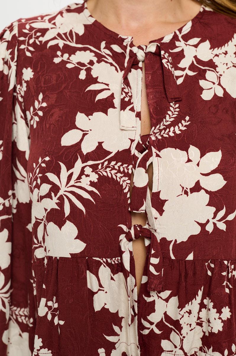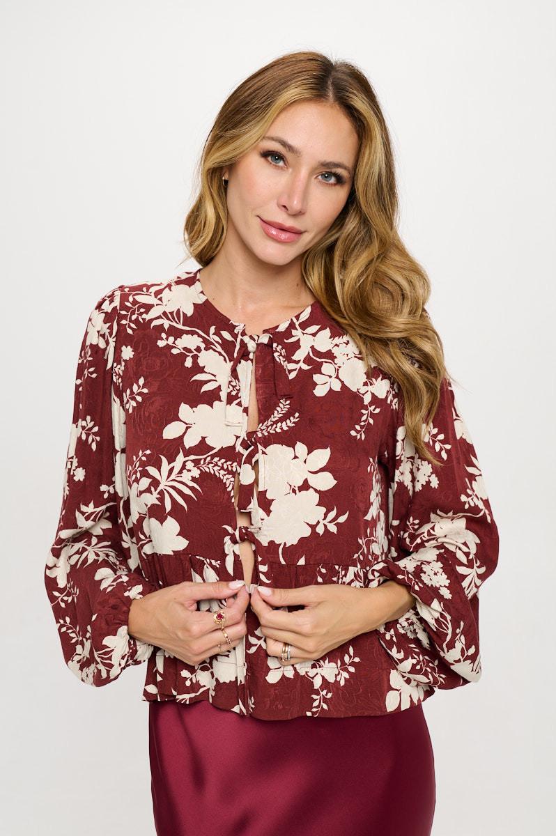 Made in USA Floral Print Top with Front Tie Detail. Available in other Colors. Fabric content: 100% Rayon.