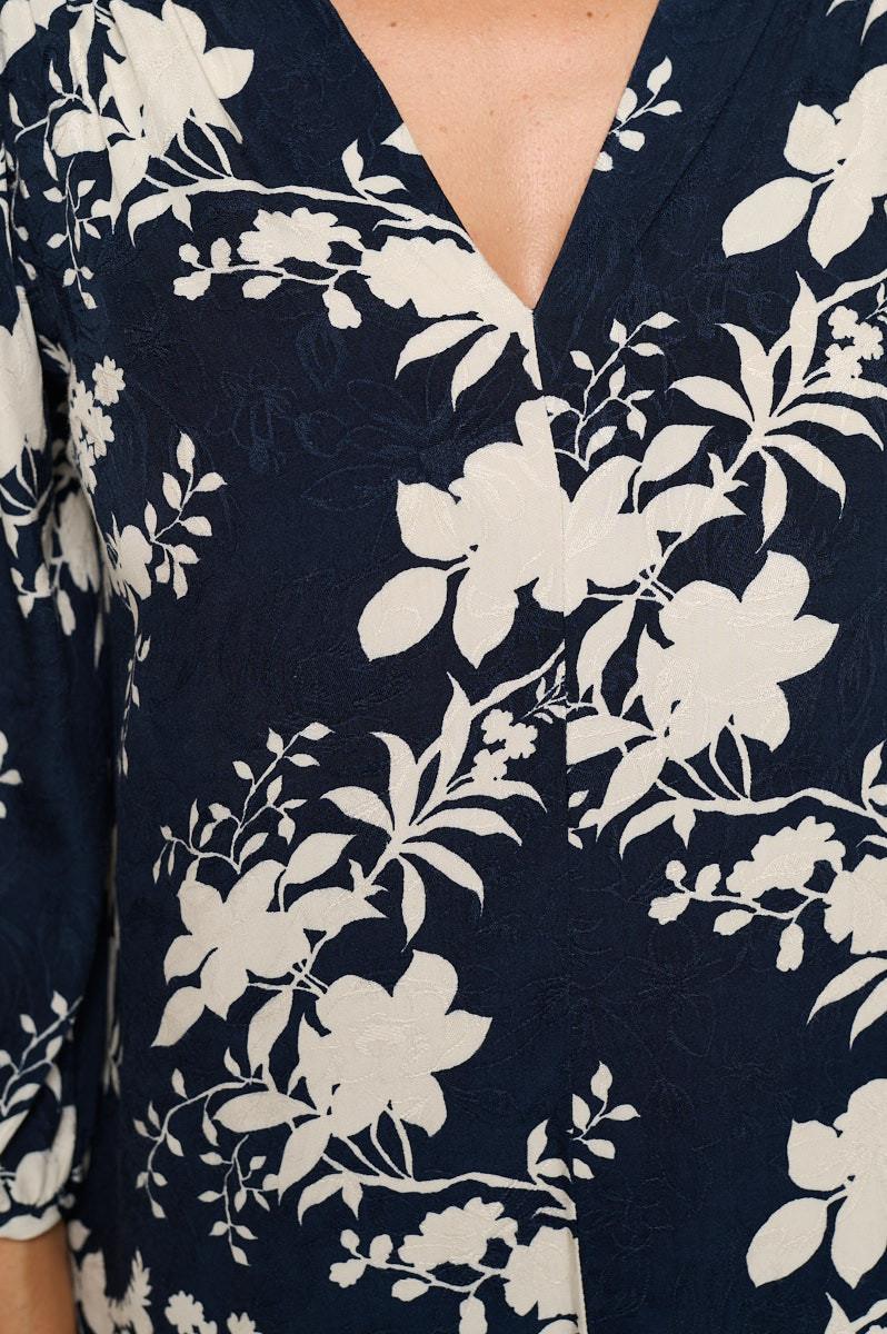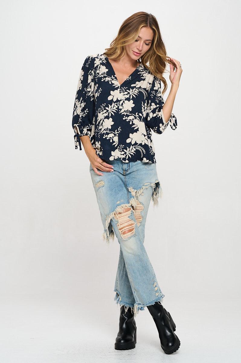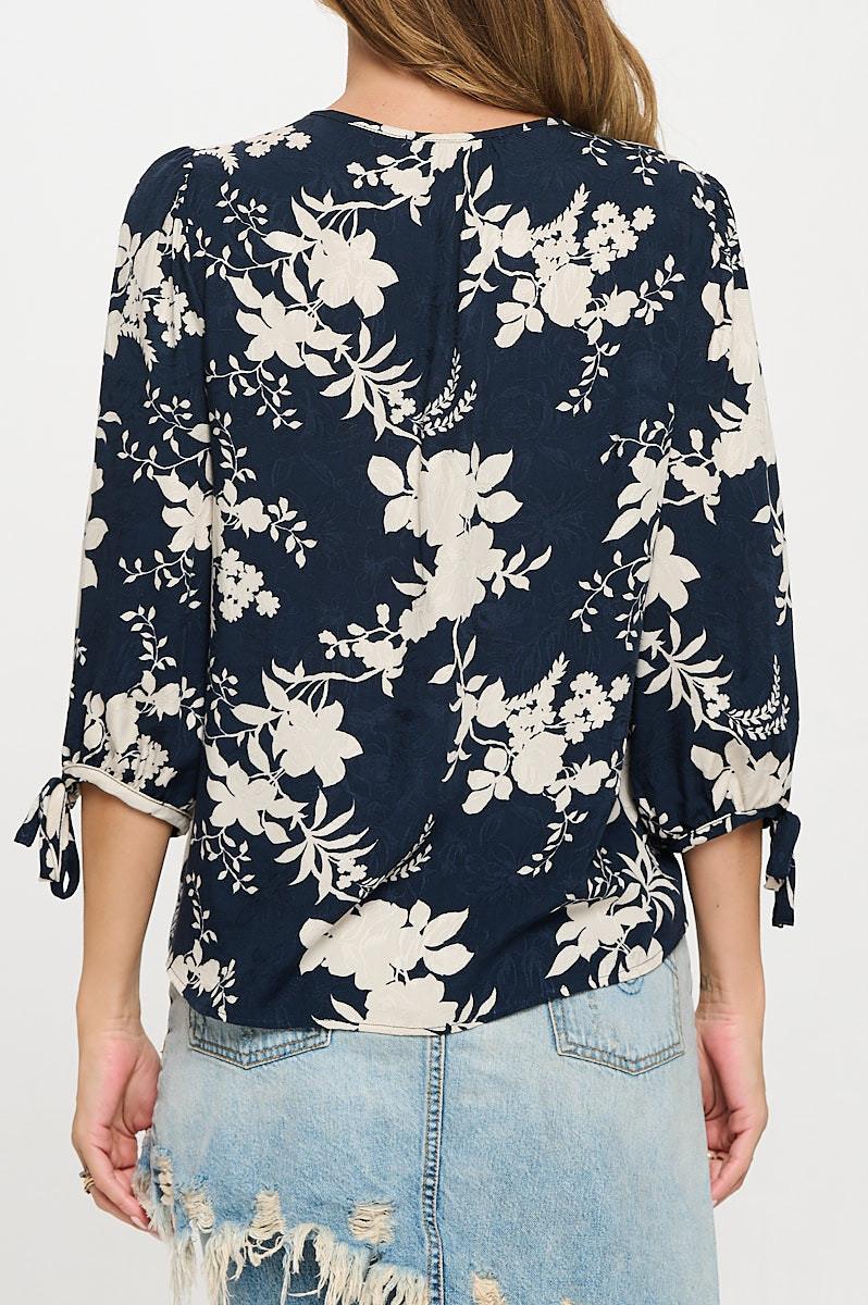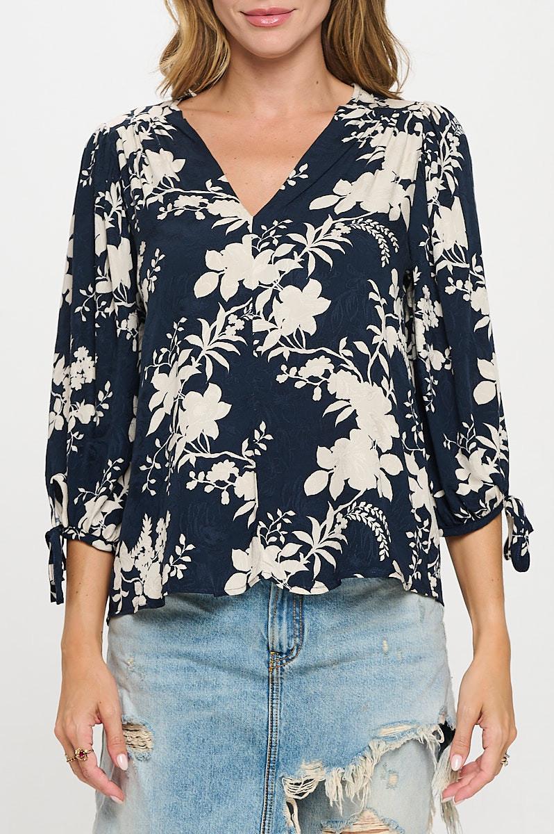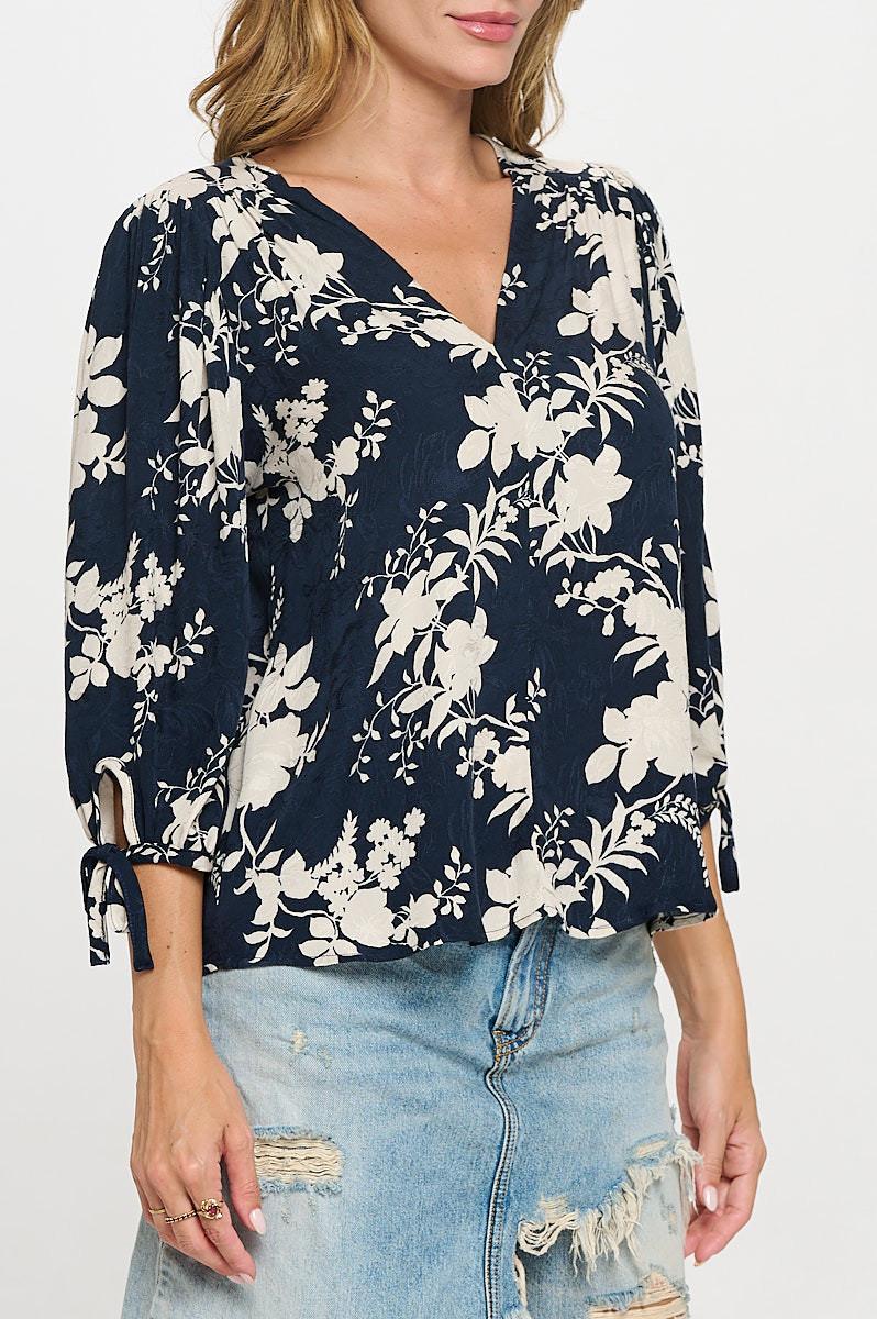 Made in USA Floral Print V neck 3/4 Sleeve Top with Tie. Fabric content: 100% Rayon.