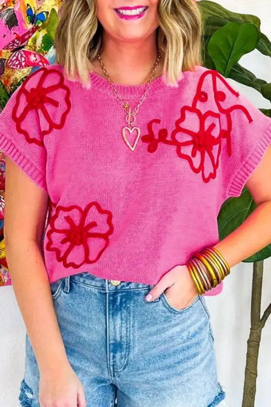 Flower Knitwear Top – Bright Pink Corded Embroidery Short Sleeve