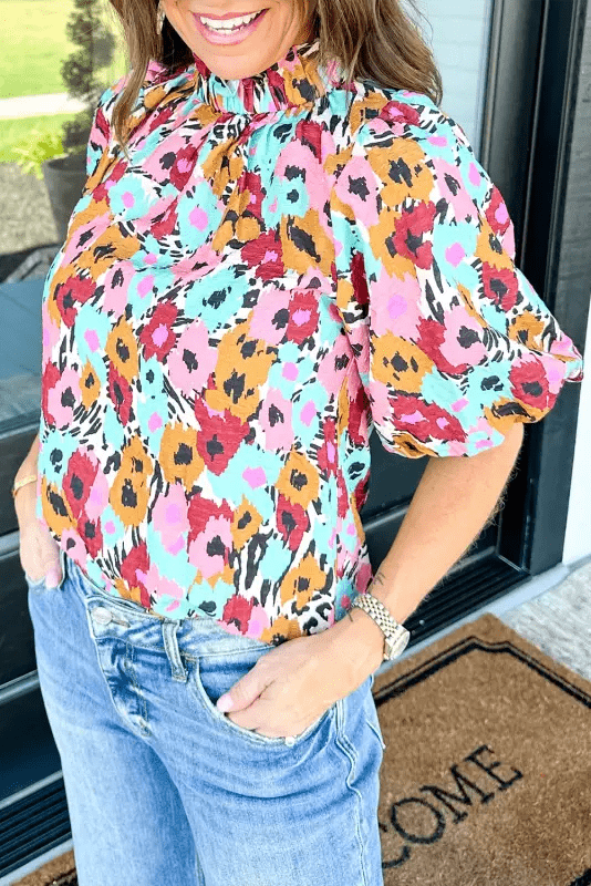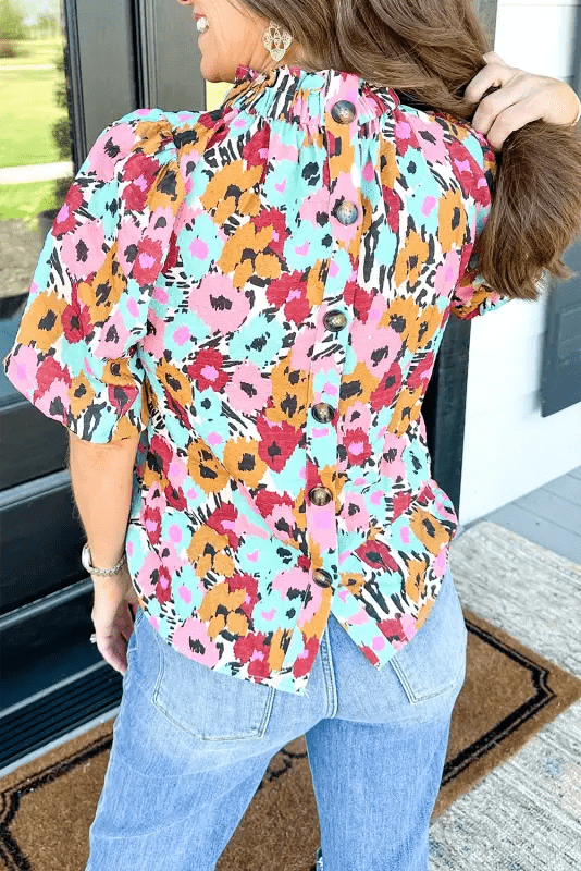 Discover the charm of our Frilled High Neck Floral Blouse with stylish back buttons. Perfect blend of fashion and comfort. Get yours today!