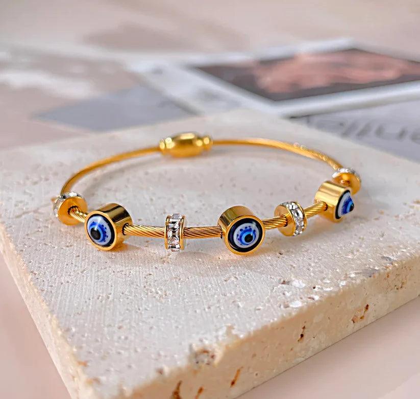 - The Golden Evil Eye Cable Bracelet pairs beautifully with other bangles or watches, adding a chic layered look that’s both meaningful and fashionable. Whether worn solo or stacked, this bracelet makes a powerful statement of faith, elegance, and confidence.