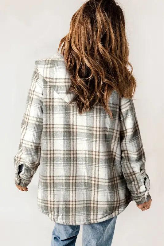 Stay cozy and stylish with our Gray Plaid Sherpa-Lined Hooded Shacket. Perfect for layering, it offers warmth and a chic look for cooler days.