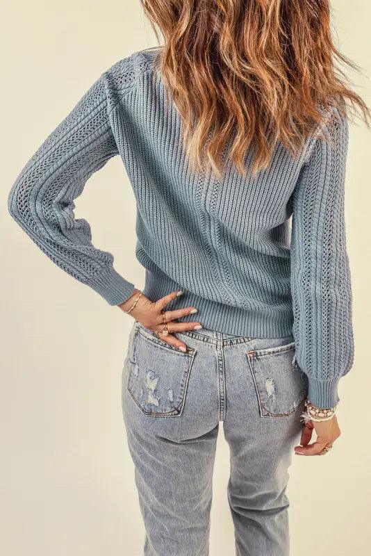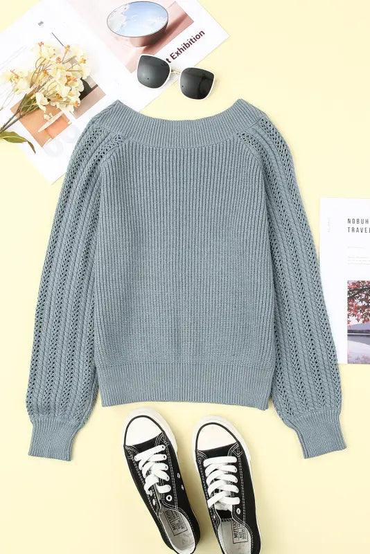 Gray Plain Hollow-out Knit Long Sleeve Pullover Sweater