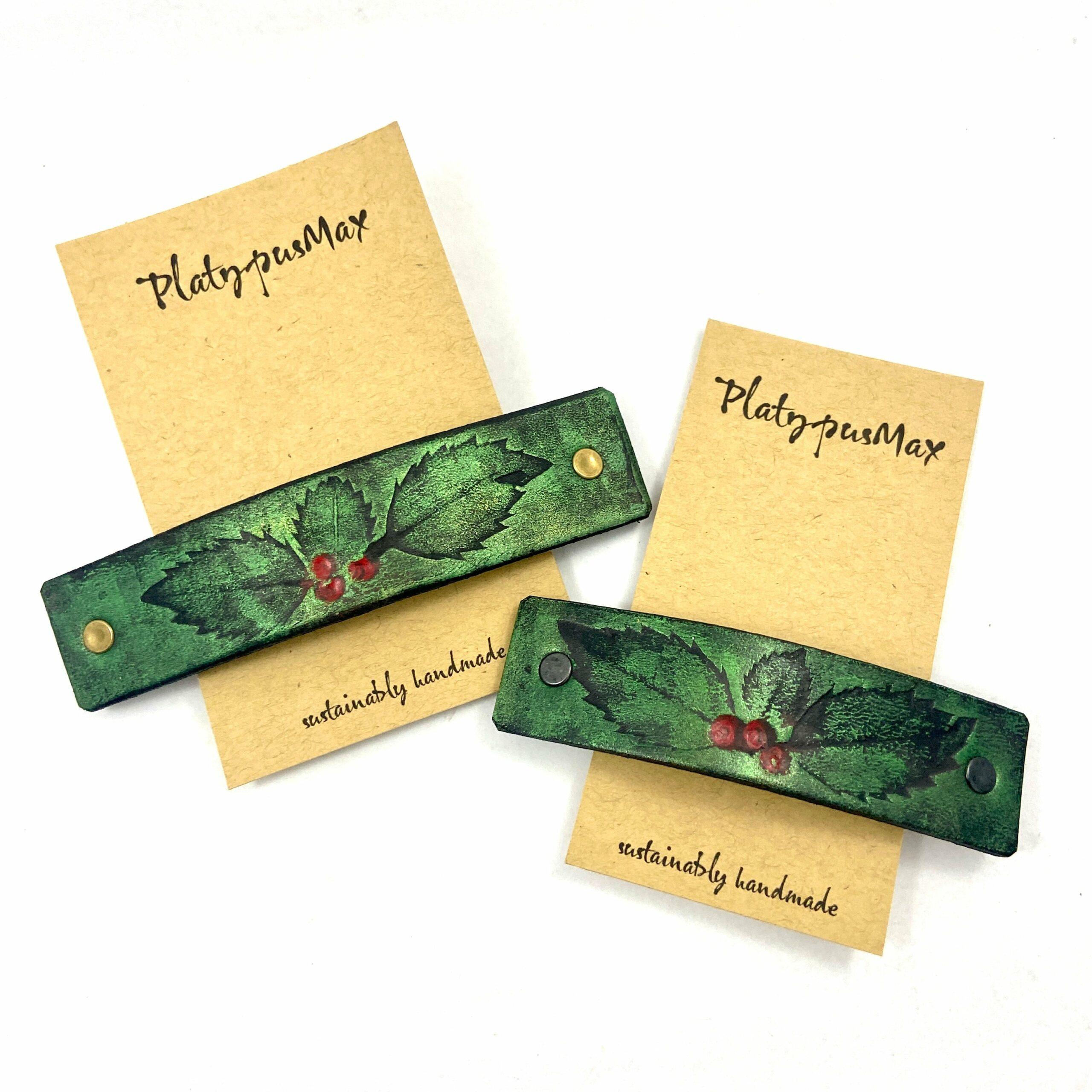 Festive holly leaves with bright red berries bring cheer to this holiday season while holding up your hair! Real holly leaves were pressed into leather to create this unique design, finished with red and metallic green finish. Your choice of antique gold or dark silver / gunmetal hardware to finish the look. Whether you are shopping for yourself or for a friend, this piece is both lovely and practical, a unique alternative to jewelry that will also allow for simple every-day hair styling with all types of long or thick hair.