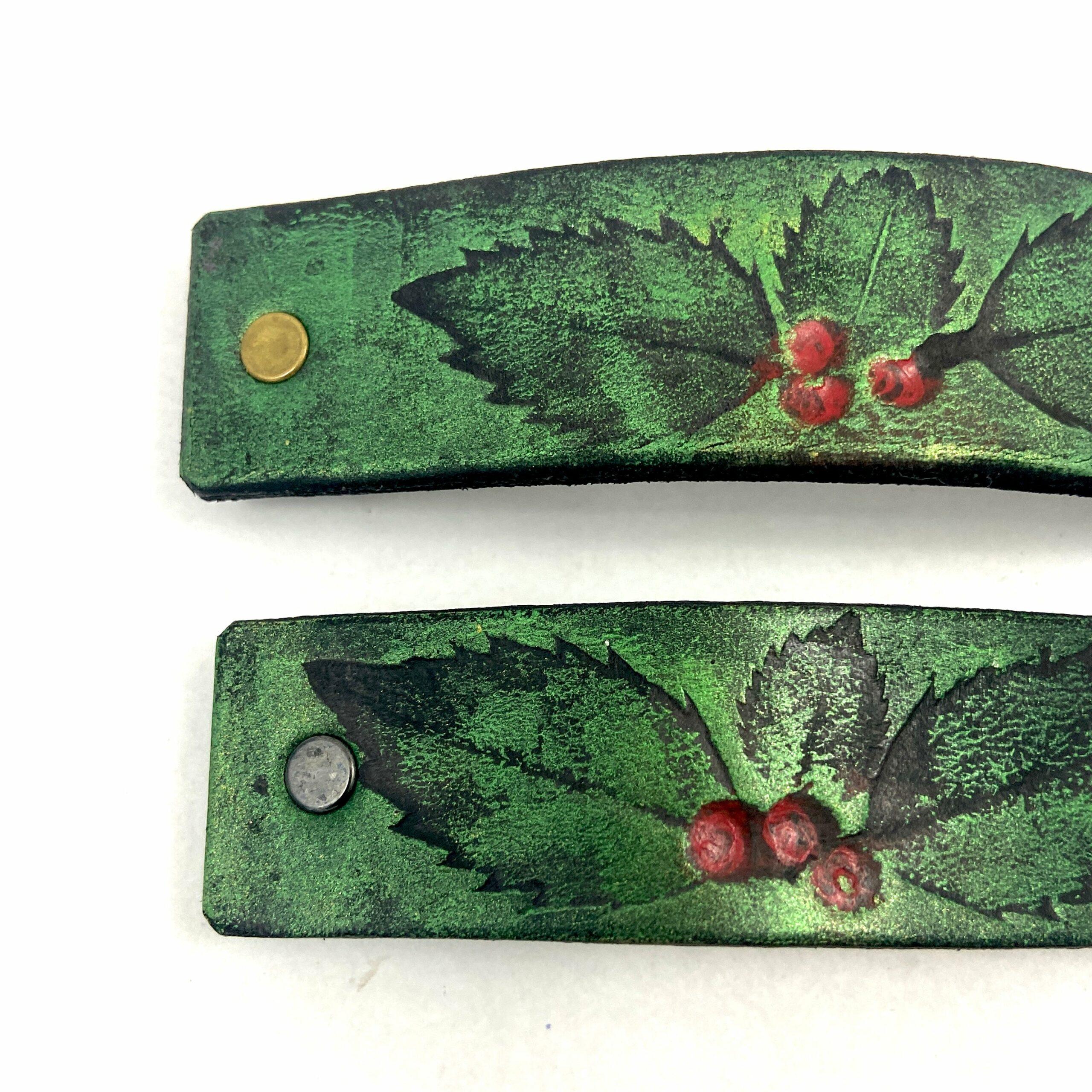 Green Holly Leaves & Red Berries Embossed Leather Hair Barrette