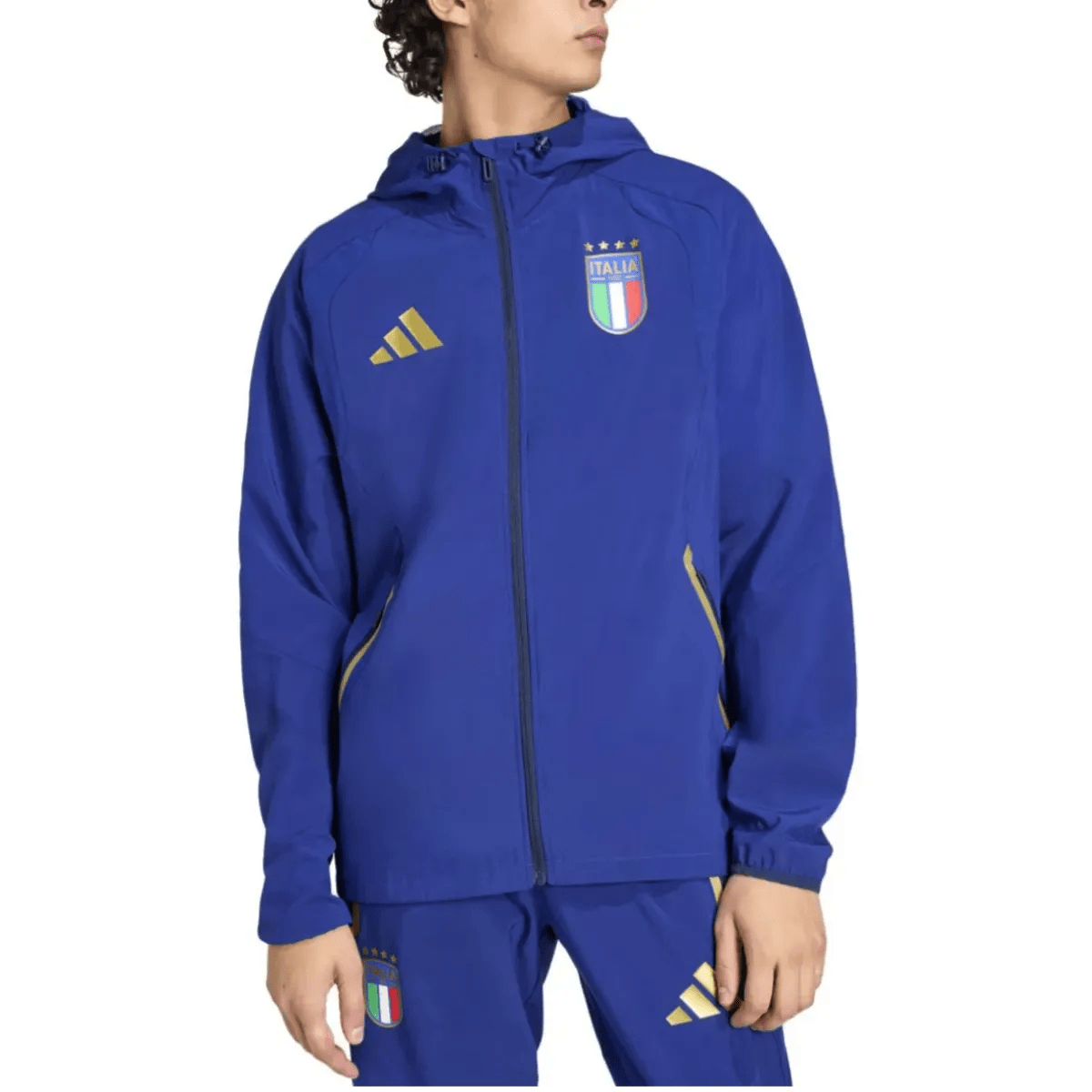 Here on SoccerTracksuits.com you can buy the official Italy Casual Travel hooded presentation tracksuit 2026/2027! Created by technical partner Adidas for the Azzurri, this set is designed for both the 2026/27 international season and the FIFA World Cup 2026. Made out of 86% polyester, and elastane, this stunning woven tracksuit features a navy blue full zip hoodie and matching pants, both adorned with beautiful gold details.