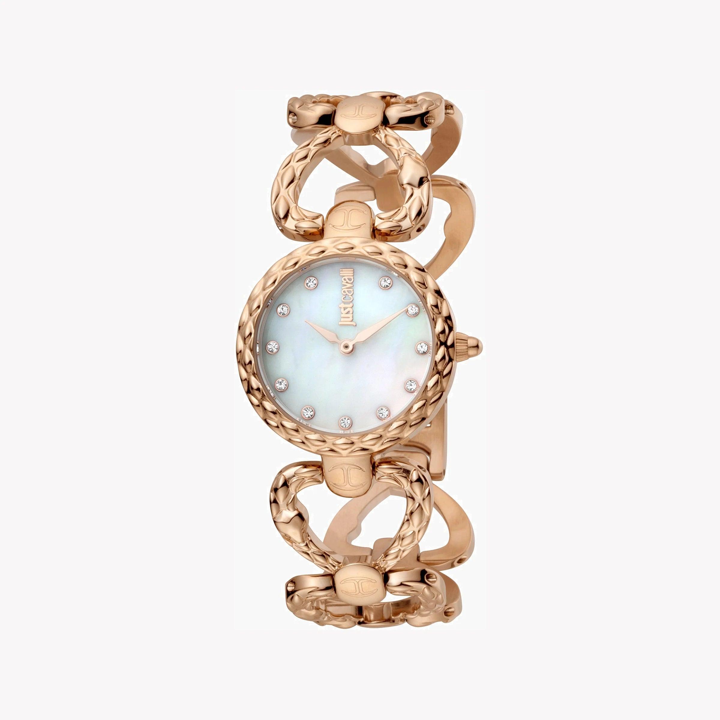 Timeless, sophisticated, elegant. This Just Cavalli Women’s Watch has it all. From the Rose Gold Stainless Steel band to the Stainless Steel Round Rose Gold case of 28 mm diameter and of course the elegant White Mother of Pearls dial, this watch is the perfect representation of the ultimate sophistication.