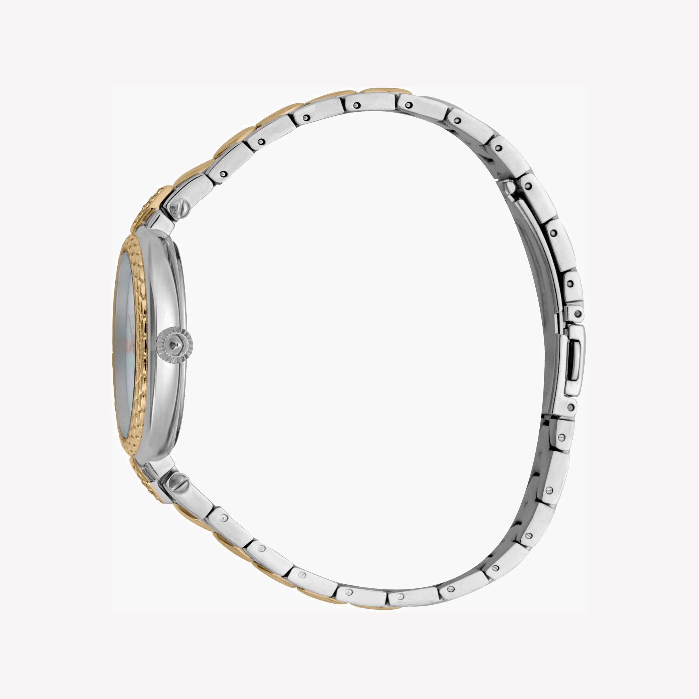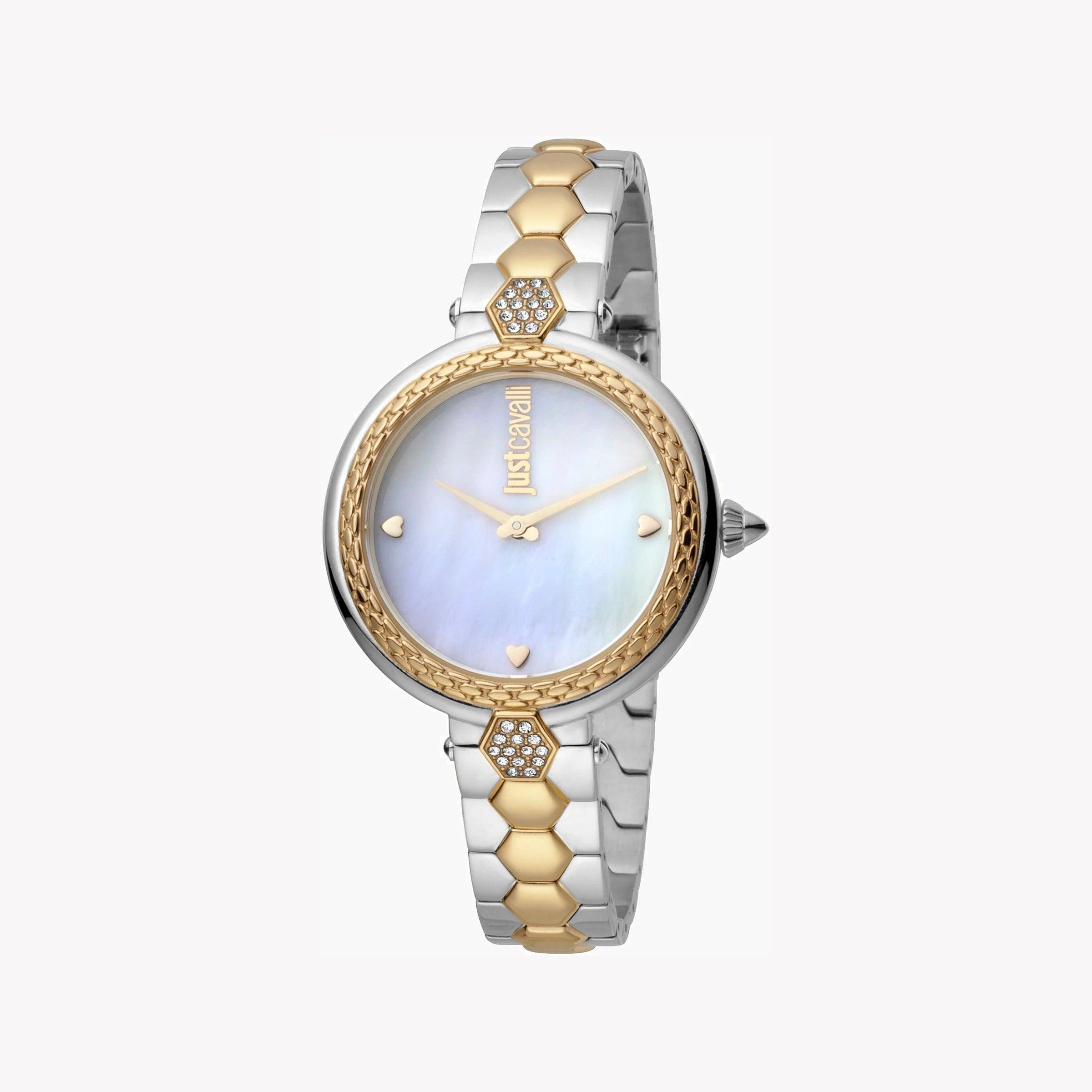 Timeless, sophisticated, elegant. This Just Cavalli Women’s Watch has it all. From the Silver & Gold Stainless Steel band to the Stainless Steel Round Gold case of 34 mm diameter and of course the elegant White Mother of Pearls dial, this watch is the perfect representation of the ultimate sophistication.