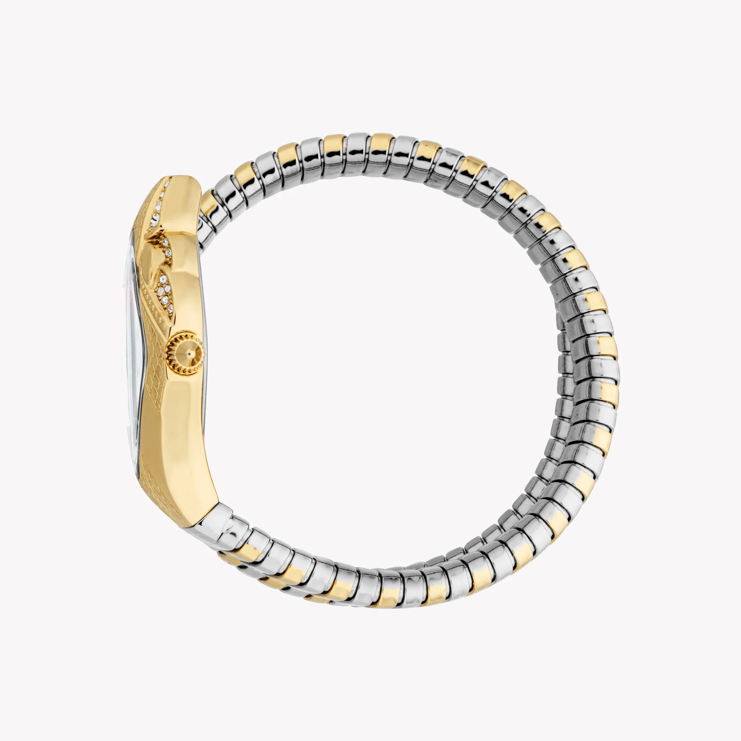 Presenting the Just Cavalli Women’s Watch, a remarkable fusion of chic design and exceptional accuracy. This stunning timepiece is more than mere utility; it’s a bold expression of your individuality. Featuring a captivating Two-Tone Silver & Gold Stainless Steel Band, along with an Asymmetrical Gold Stainless Steel Case sized at 22 x 36.5 mm, this watch captures the essence of avant-garde sophistication. The radiant White Mother of Pearls Dial adds a layer of charm, ensuring it stands out in any setting.