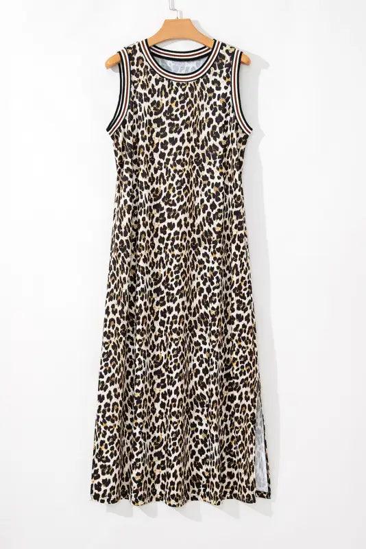 Unleash your wild side with this Leopard Sleeveless Maxi Dress. Show off your fierce fashion sense with the eye-catching leopard print and stay cool and comfortable in the sleeveless design. Perfect for any occasion, this dress will have you looking fierce and fabulous.