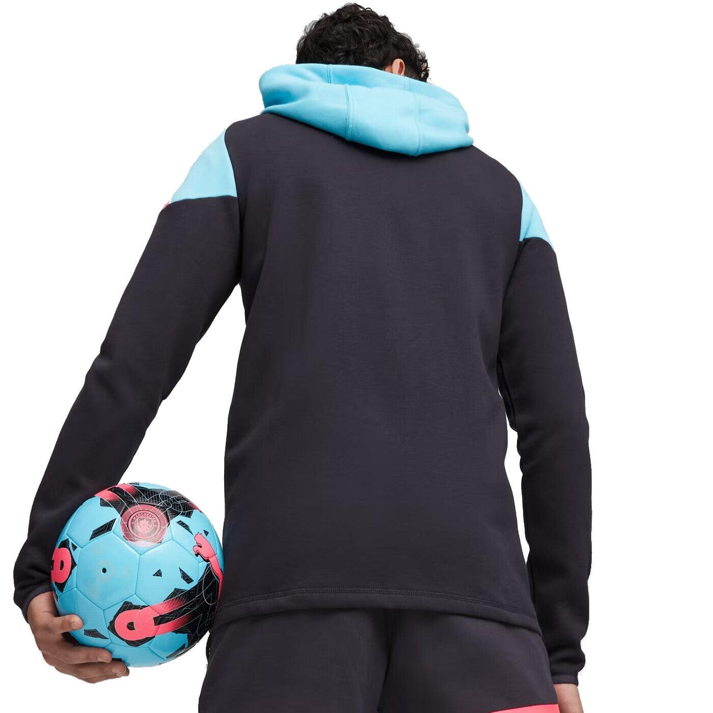 Manchester CIty FC, the Citizens! Here you can buy their Casual hooded presentation tracksuit, designed by technical sponsor Puma for 2023/2024 english soccer season, to be worn before and after Premier League games at the Etihad stadium in Manchester.
