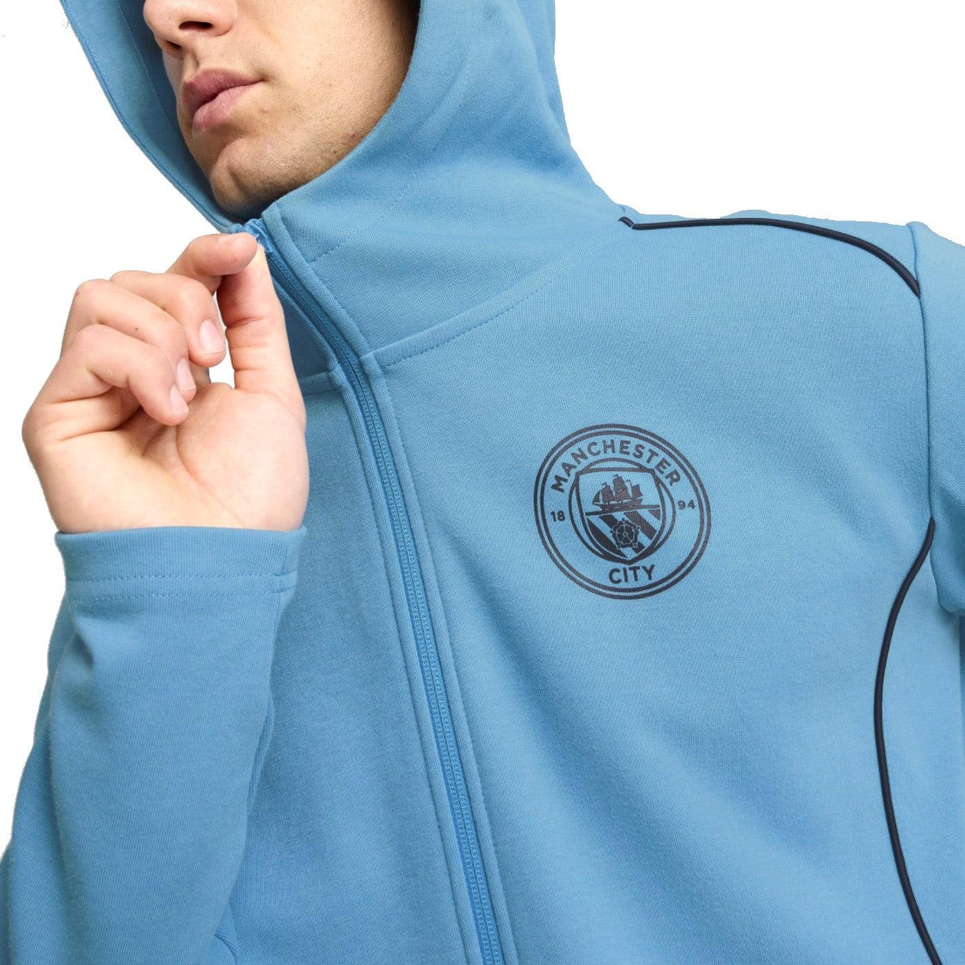Man City casual hooded tracksuit. New 2024/2025 official Manchester City FC Casual hooded presentation tracksuit, brought to you by technical partner Puma. This classy set includes a stunning light blue full zip hoodie and matching navy blue pants, perfect for wearing everywhere for your leisure time.