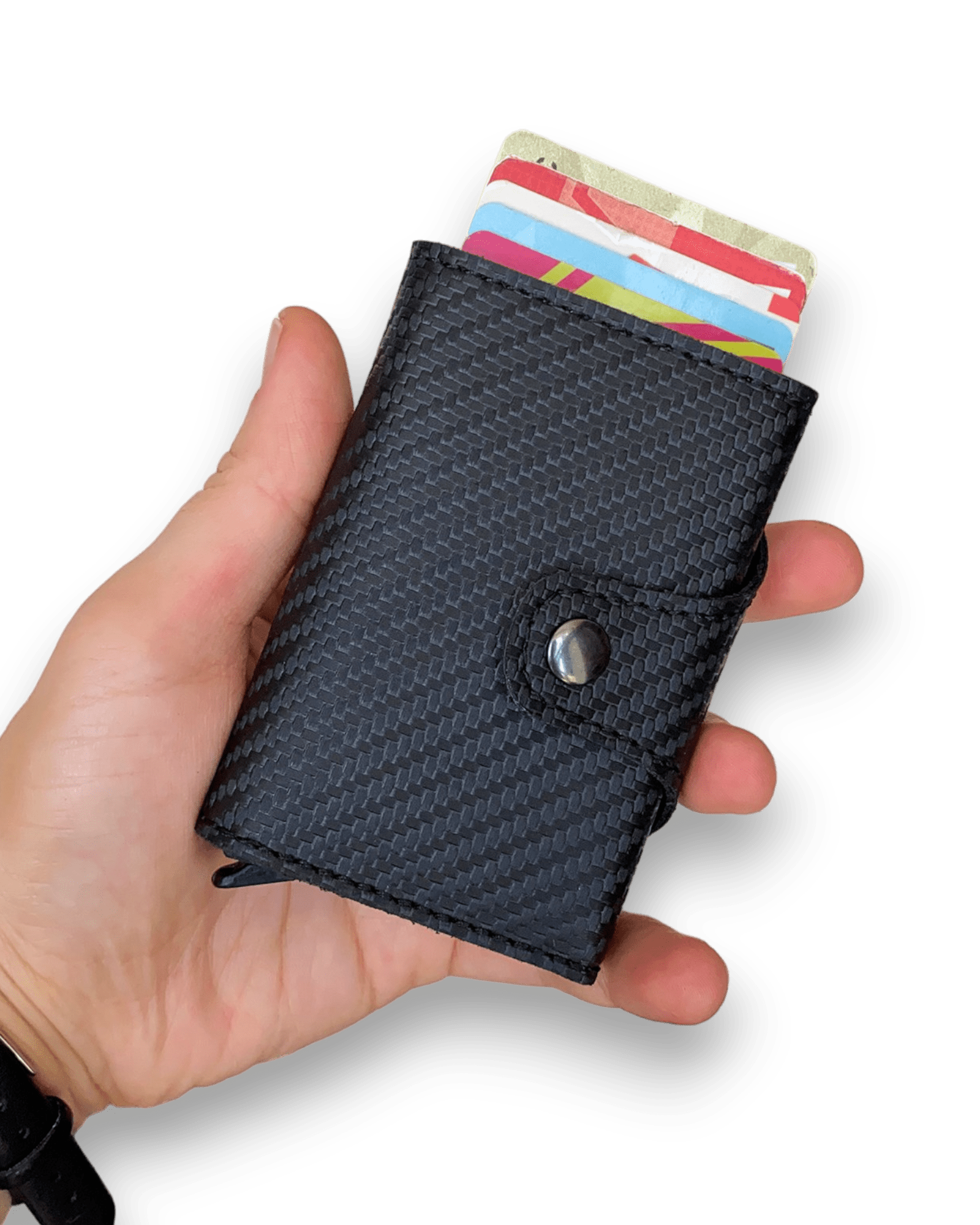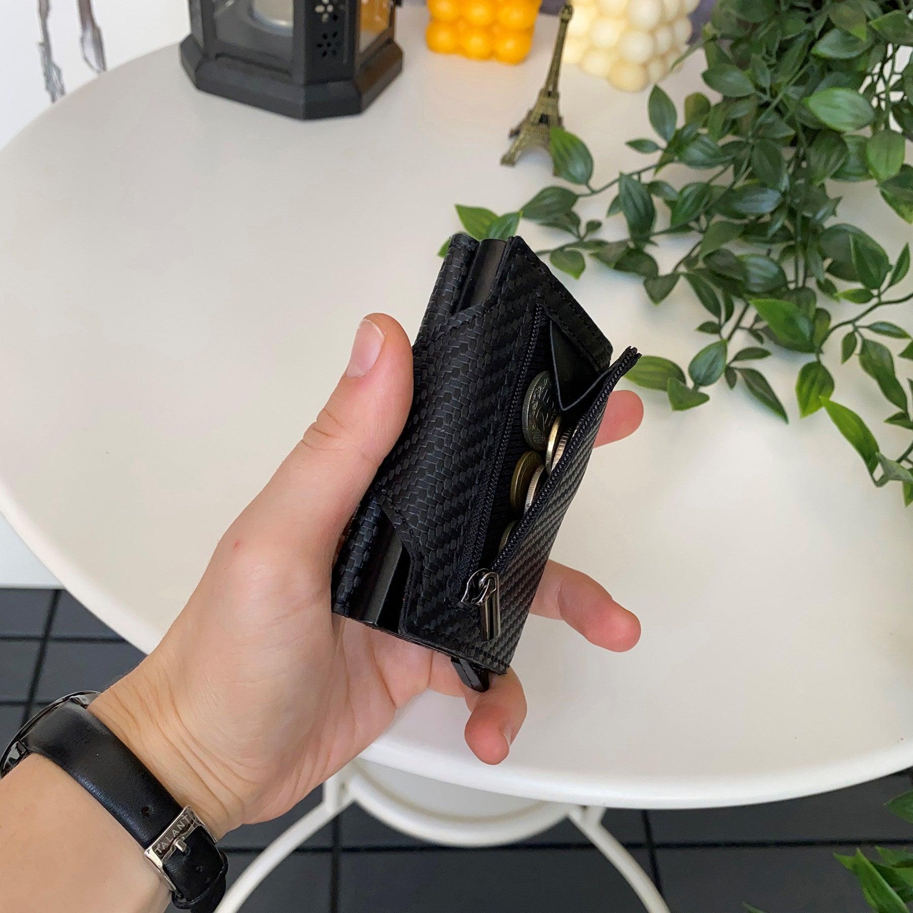 Mechanism Feature: The wallet features an aluminum mechanism inside it. This mechanism both grants RFID technology to the wallet, and the protection it provides to your cards. The aluminum structure prevents your cards from scratches and outside damage, and swiftly and smoothly pops-up your cards when triggered. Also, this pop-up technology prevents your cards from falling from your wallet.