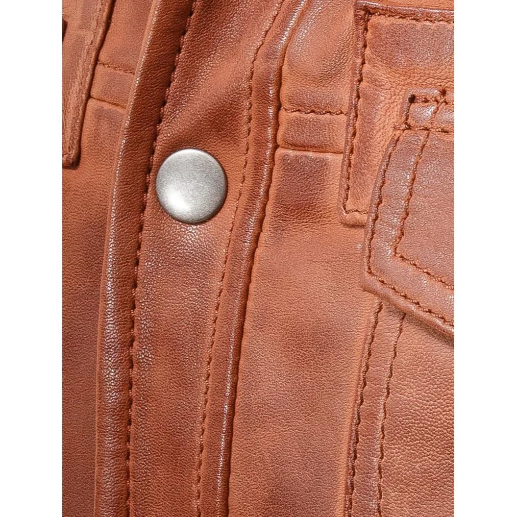 Created from brown, super-soft sheep aniline, this jacket features a press stud fastened front with a shirt style collar. There are two flap patch pockets at the chest with another couple of pockets at the waist. The cuffs are press stud, shirt gauntlet style while the interior is fully poplin lined and incorporates two more leather trimmed pockets, one of which is zipped.