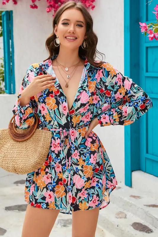 Multicolor Floral Buttoned Collared Long Sleeve Mini Dress