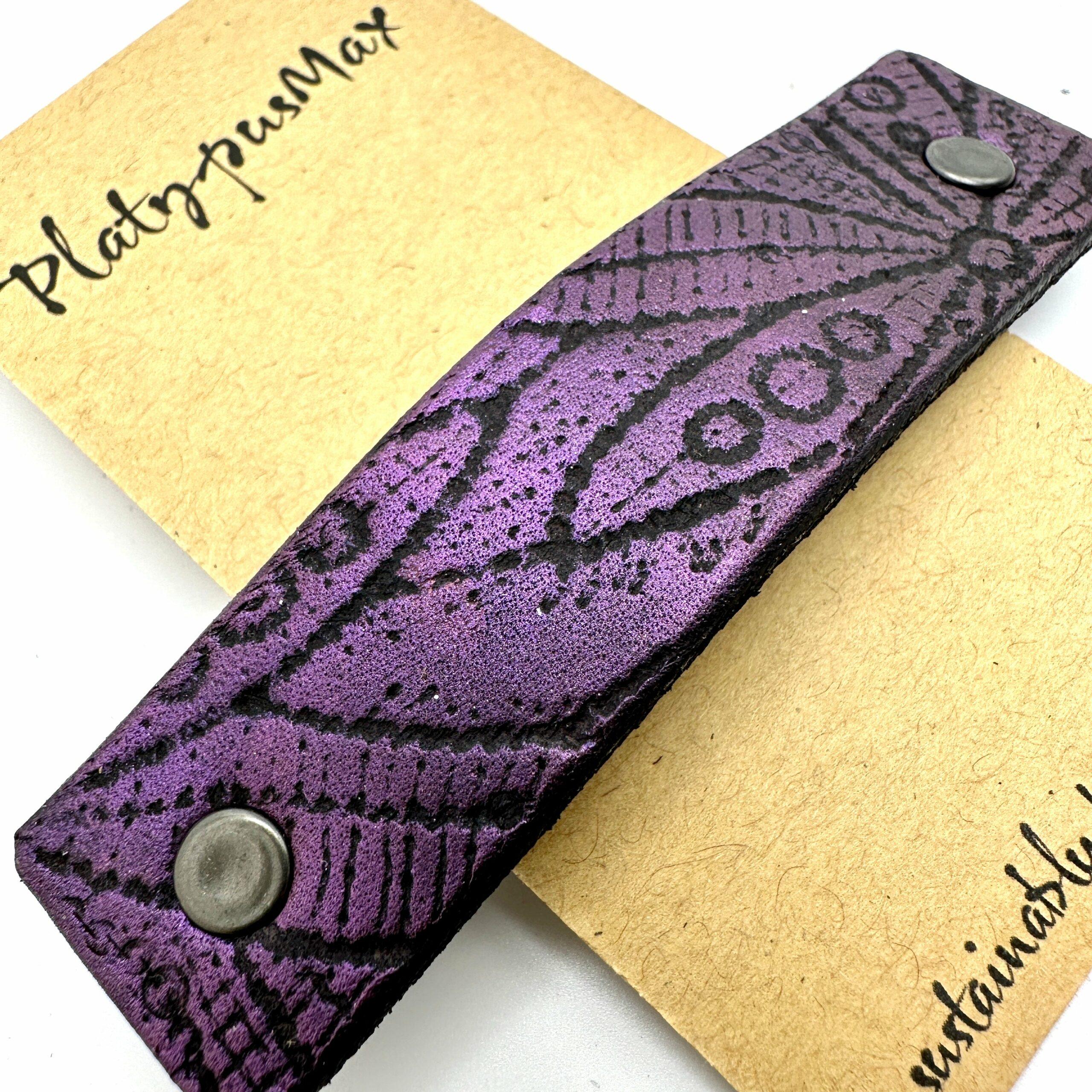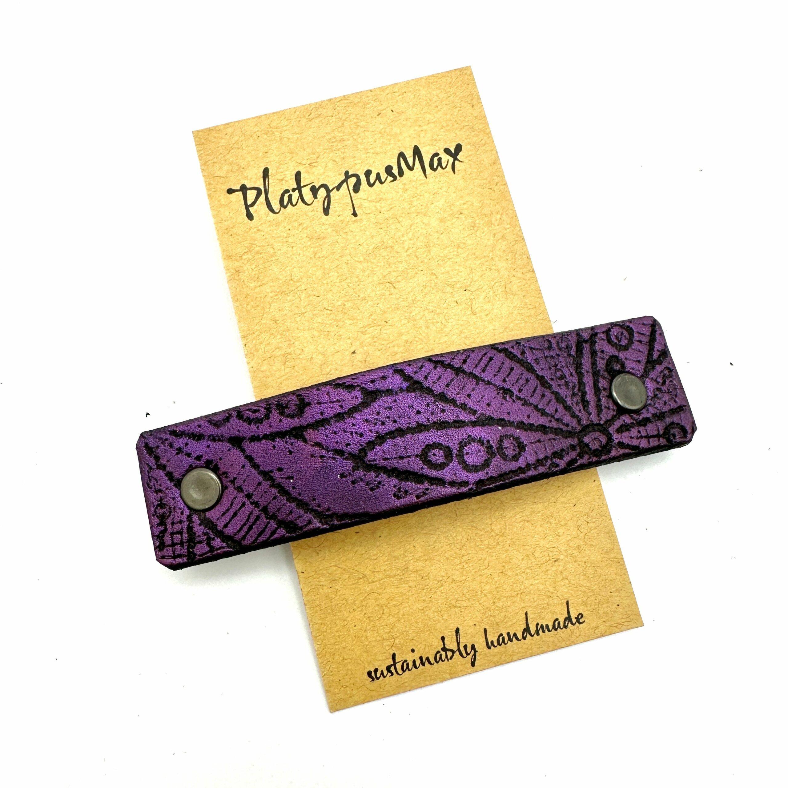 Purple flowers hair barrette: Shimmery metallic purple brings the textured hand-dyed black leather to life. A boho, flower-child flower design is handcrafted in biodegradable vegetable-tanned scrap-only leather. French spring style leather hair barrette. The a unique textured flower pattern was created by embossing vintage lace! Perfect practical gift with a splash of purple. A truly unique and plastic-free hairpiece.