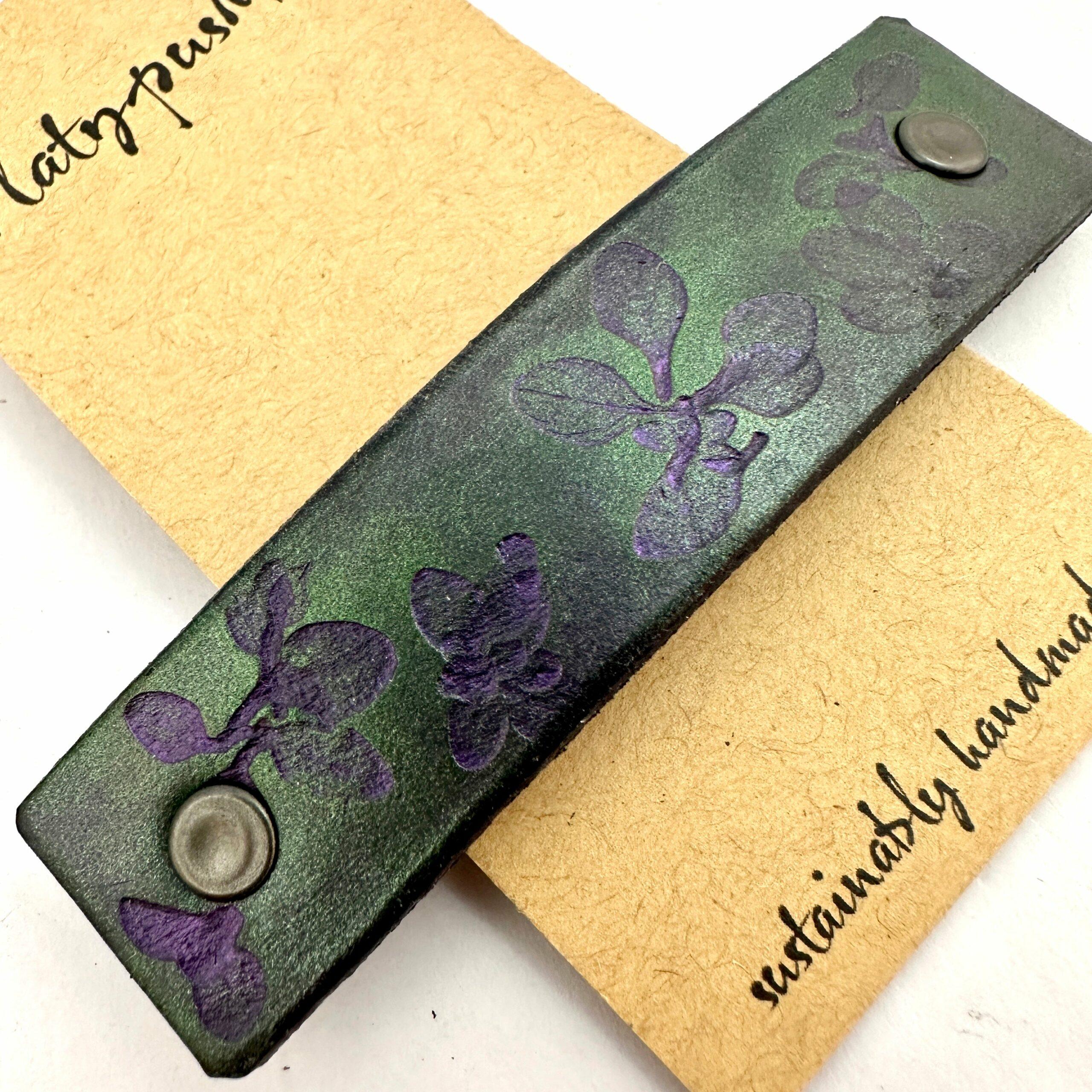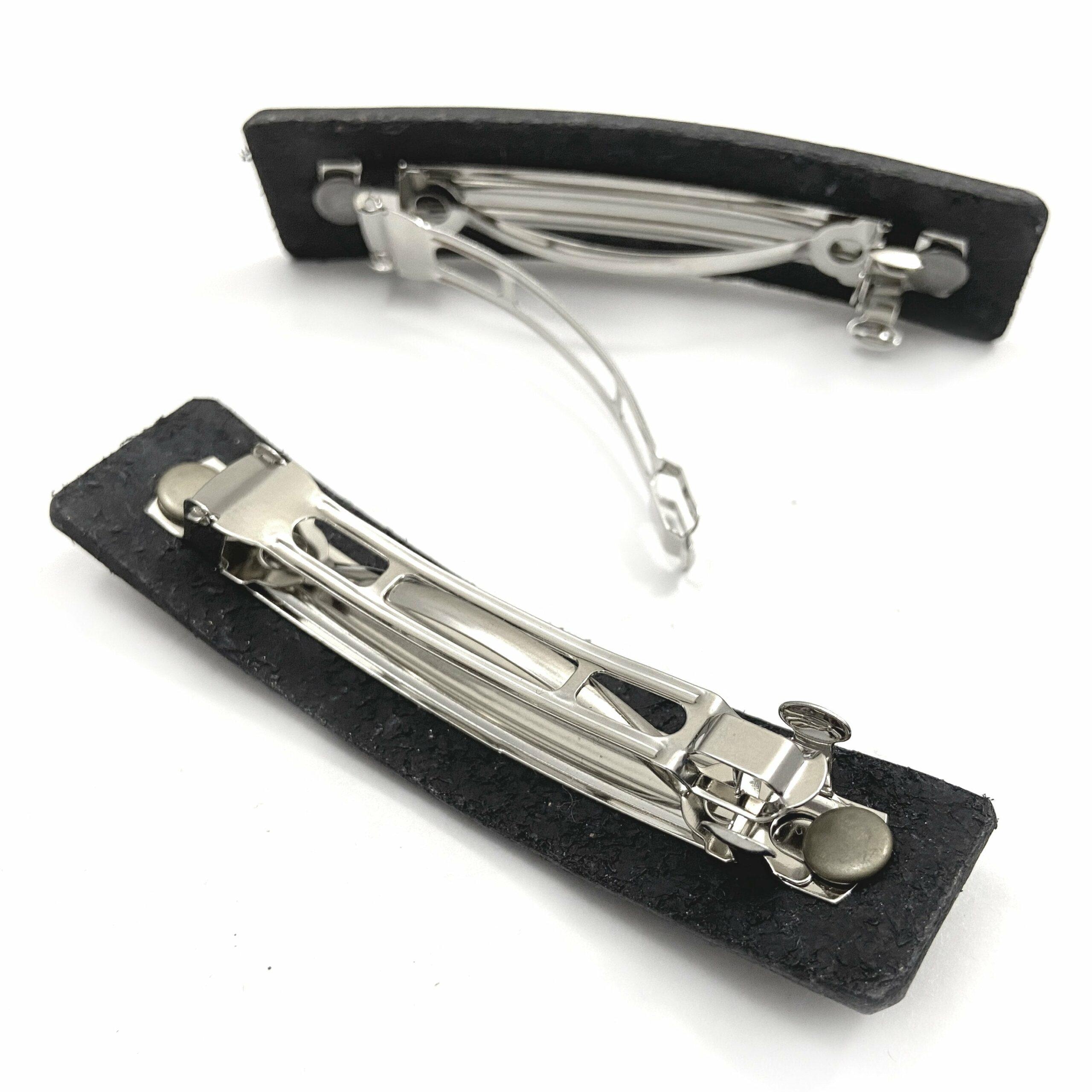 Unique, beautiful and strong hair clip made of biodegradable eco-friendly scrap leather, hand cut and embossed with twigs to conjure the feeling of a forest in a winter snowstorm, ready to explore or settle in by the fire. Painted white over naturally black hand dyed leather, with a light silver shimmer, like a frosty evening. A simple and extremely functional miniature piece of art for your hair! Makes a great gift, or just get it for yourself.