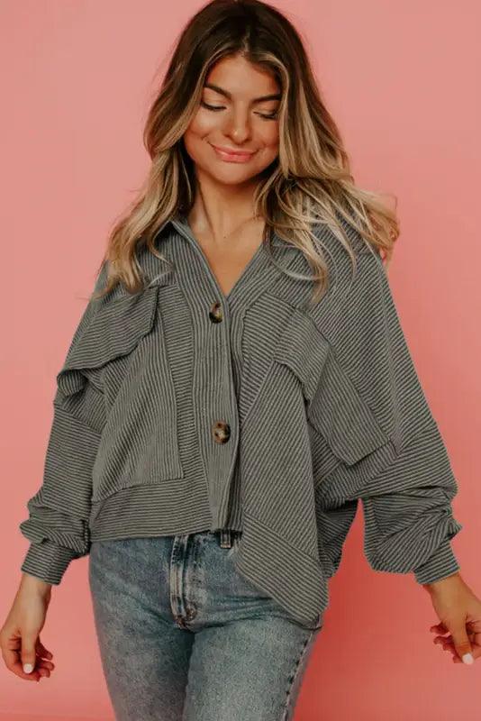 Indulge in luxury with our Real Teal Boxy Fit Pinstriped Shacket. This sophisticated and exclusive piece features a striking teal color and a unique boxy fit, perfect for making a statement. With a touch of elegance and a subtle pinstriped pattern, this shacket is a must-have for any fashion-forward individual. Elevate your wardrobe with this one-of-a-kind piece today.