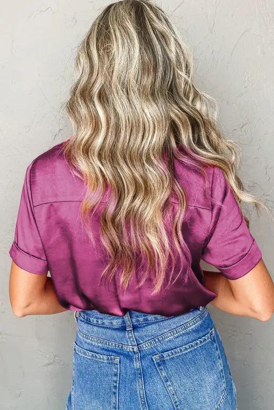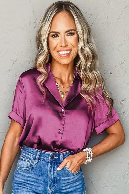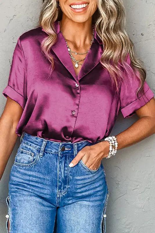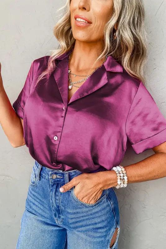 Add a touch of charm to your wardrobe with our Rose Red Fold Cuffs Satin Shirt. The elegant rose red color and unique fold cuffs make this short sleeve shirt stand out from the rest. Perfect for any occasion, this shirt will bring a playful and sophisticated touch to your style.