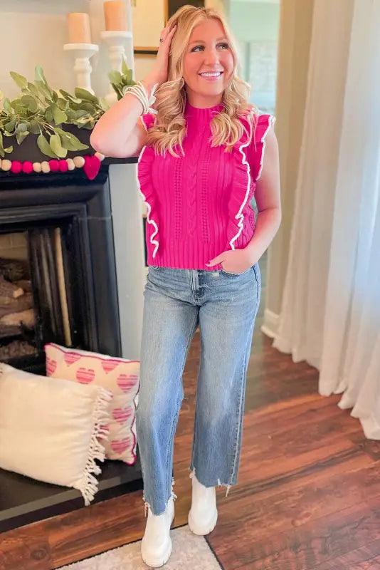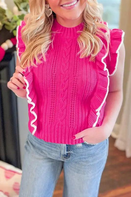 Complete your look with our Ruffled Rose Sweater Vest. Combining fashion-forward elements with cozy comfort, this vest features delicate ruffled detailing and a soft knit material. Perfect for layering, it adds a touch of sophistication to any outfit. Upgrade your wardrobe and stand out in style.