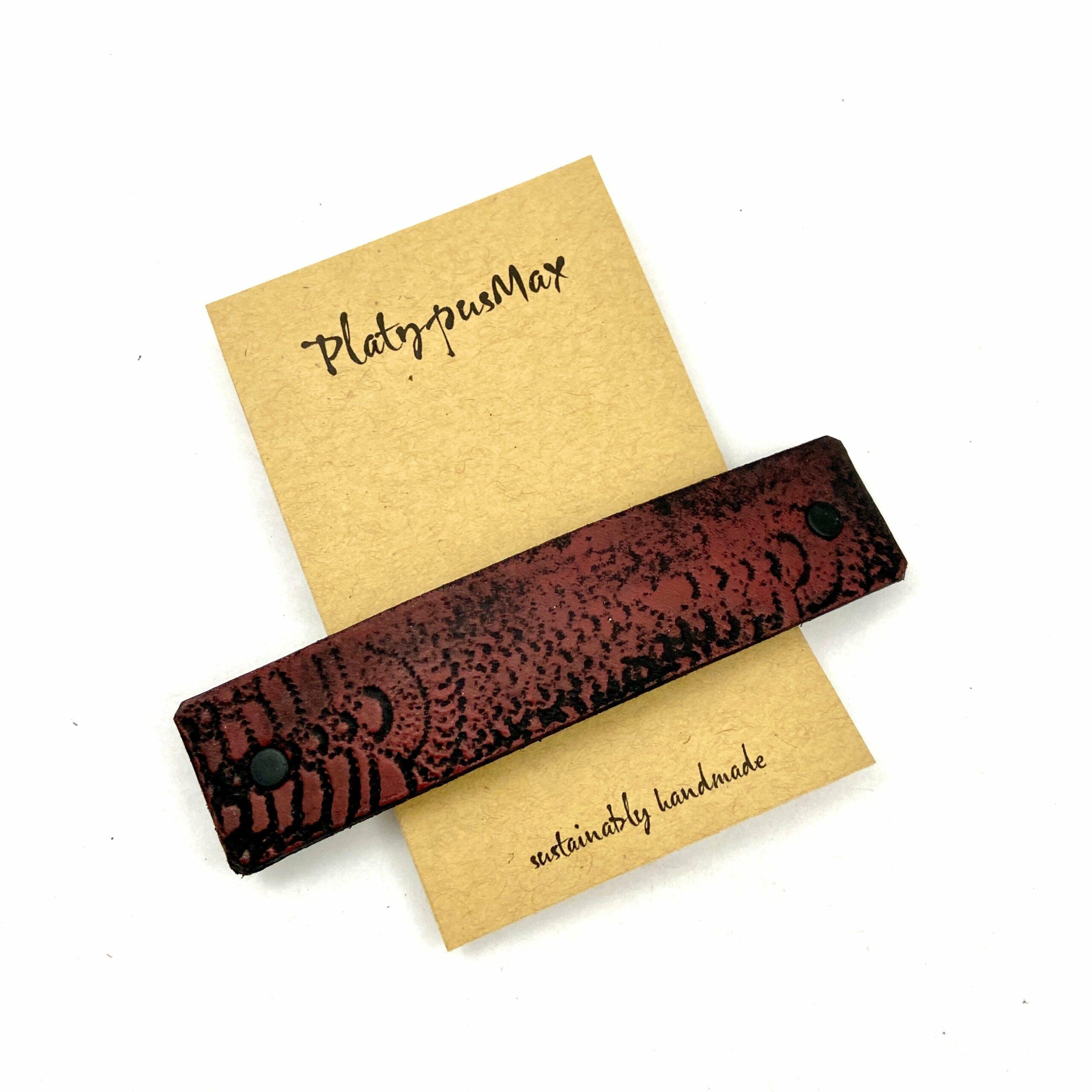 This textured cinnabar red leather hair barrette features a rustic embossed vintage lace texture. Color is rich brick red, reminiscent of antique Chinese lacquer or a distressed Indian batik stamp. Under the red is naturally hand-dyed black leather, from reclaimed remnant stock. It makes a great gift for anyone with long hair and a vintage vibe as a nice practical alternative to jewelry. Add a brilliant but warm earthy splash of red to your look while keeping your hair out of your way.