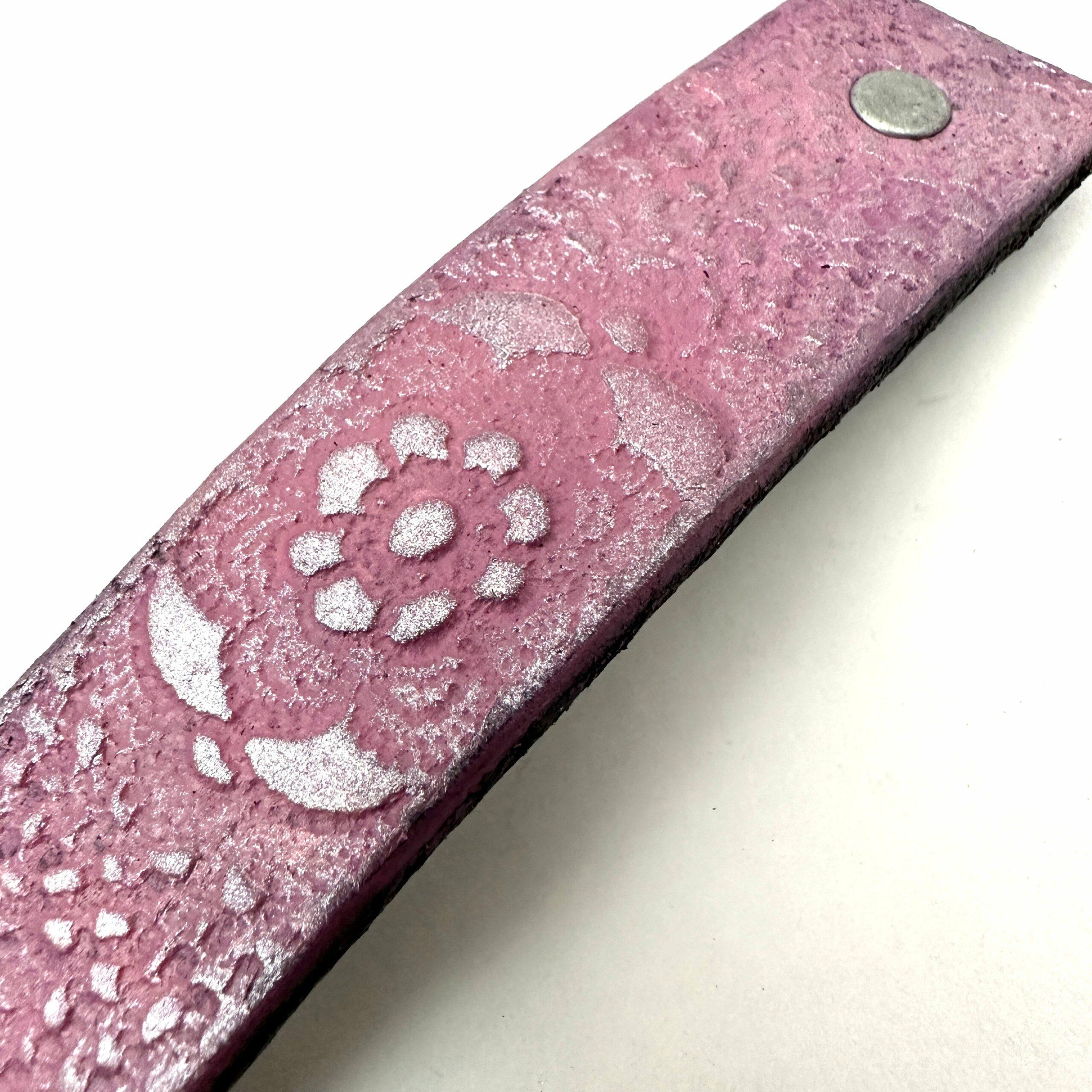 Vintage style silver and pink flower hair clip. Hand painted dusty rose over black leather with an antique metallic finish give this rustic French style leather hair barrette and antique vibe. The a unique textured flower pattern was created by embossing vintage lace. Perfect practical gift with a touch of pink for Valentine’s Day, or an alternative to cut flowers all year round. A truly unique and plastic-free hairpiece.