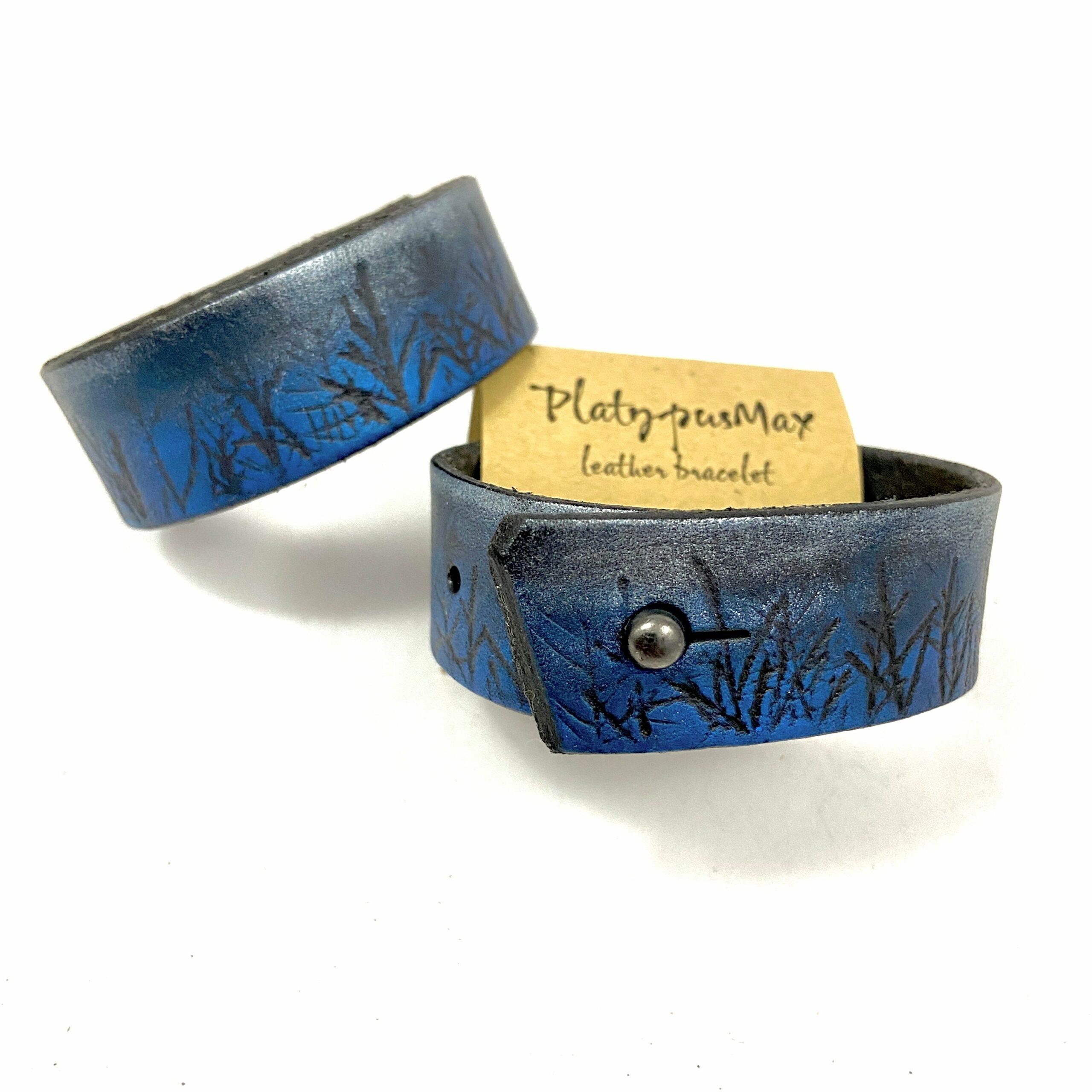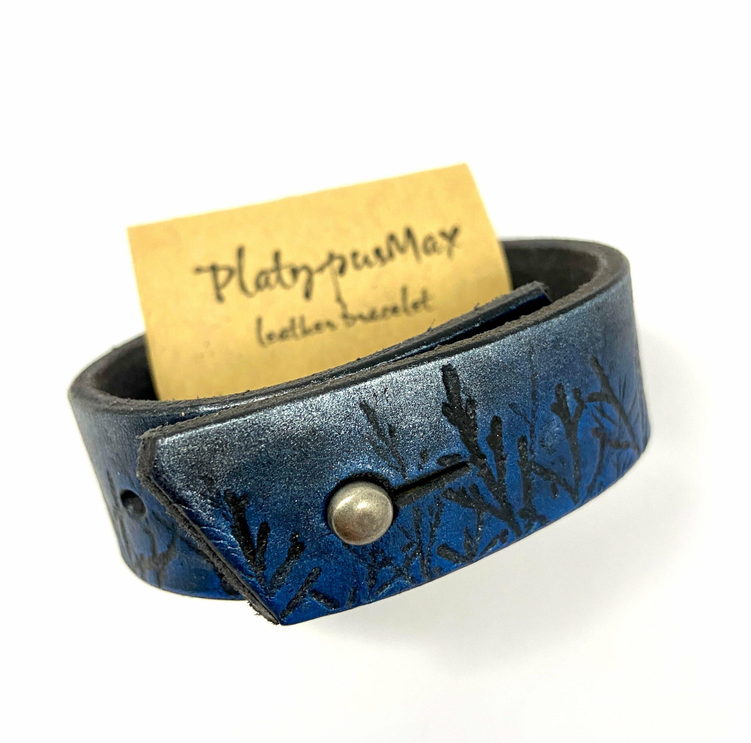 This unique blue, silver and black shimmery cuff bracelet is handmade from upcycled scrap leather. Pressed sprigs of juniper branches appear as a miniature forest in twilight glow, that wraps around your wrist. Easy on / off with a simple hitch clasp. Adjustable clasp positioning makes for safe gifting, too – no need to worry if it will fit! Simple angled end; coordinates with a variety of metal tones. Simple and secure, easy to use ball hitch closure.Â