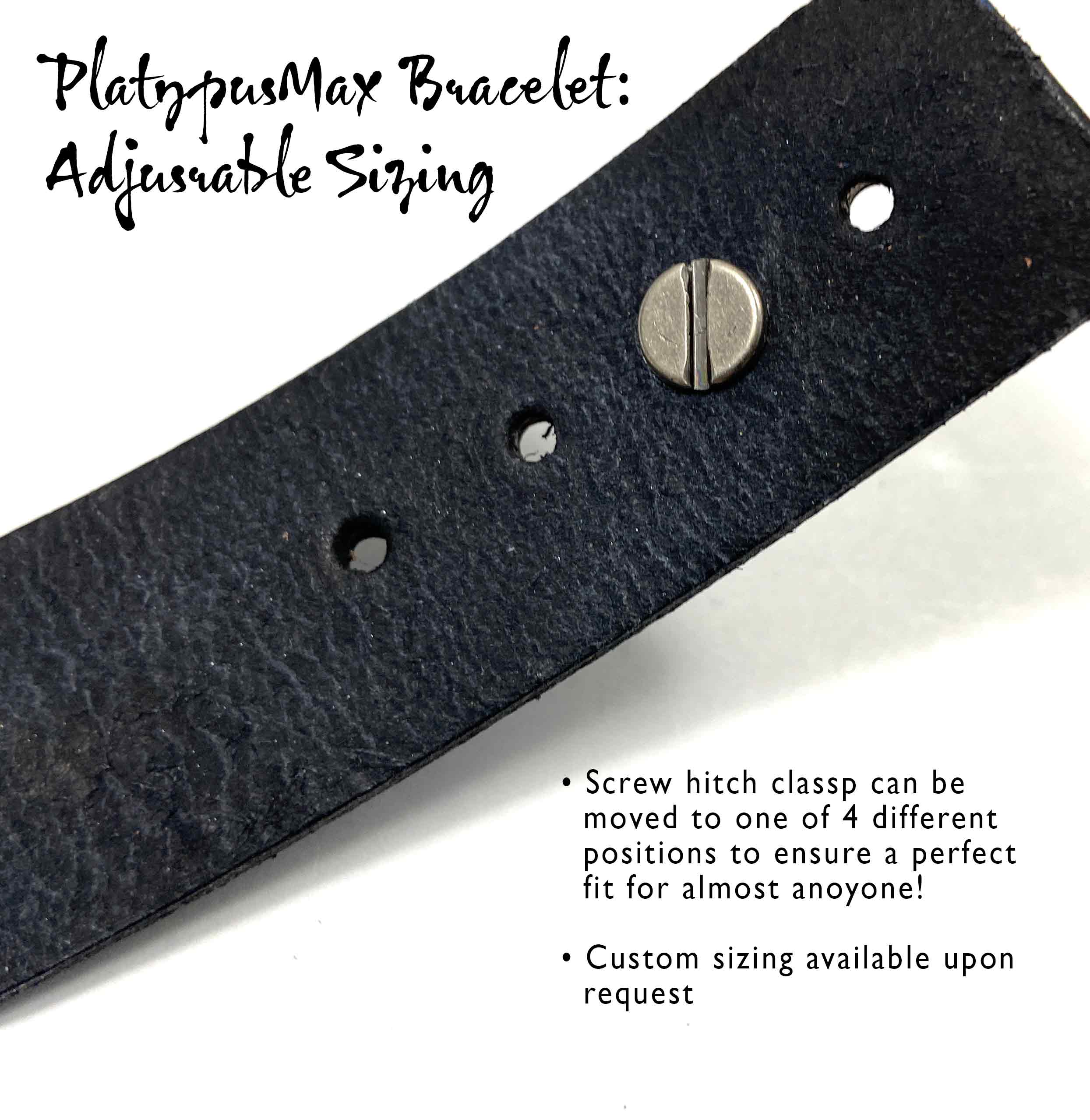 Several holes allow you to position the ball hitch clasp to fit your wrist, so no need to worry about fit. A standard screwdriver (or in a pinch a coin or butter knife) will allow easy resizing of the functional cuff length. Holes are positioned approximately to accommodate most adult women, at for the following positions (hole to hitch):