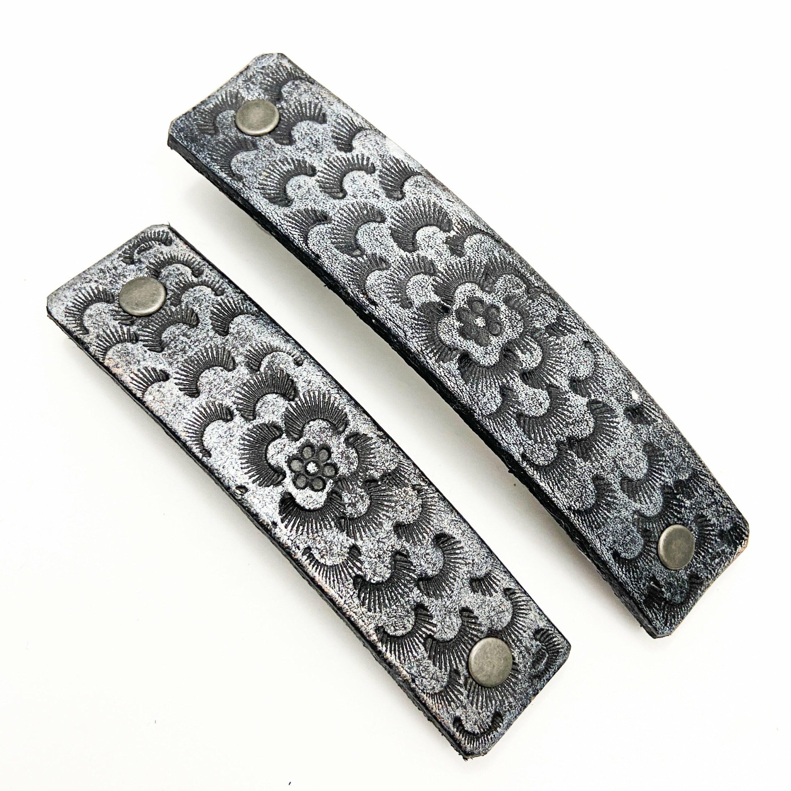 This one-of-kind leather hair barrette features a tooled chrysanthemum flower design with in dark silver on black leather. This hand-dyed and hand-painted finish has a unique colorful metallic appearance, but the clip is not heavy like metal, nor prone to tarnishing. Great for everyday use, and also perfect for dressing up your hair. It makes a great gift for anyone with long hair and a vintage vibe as a nice practical alternative to jewelry. Or, just treat yourself.