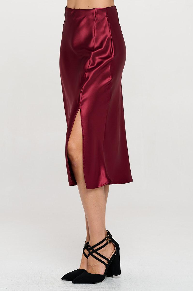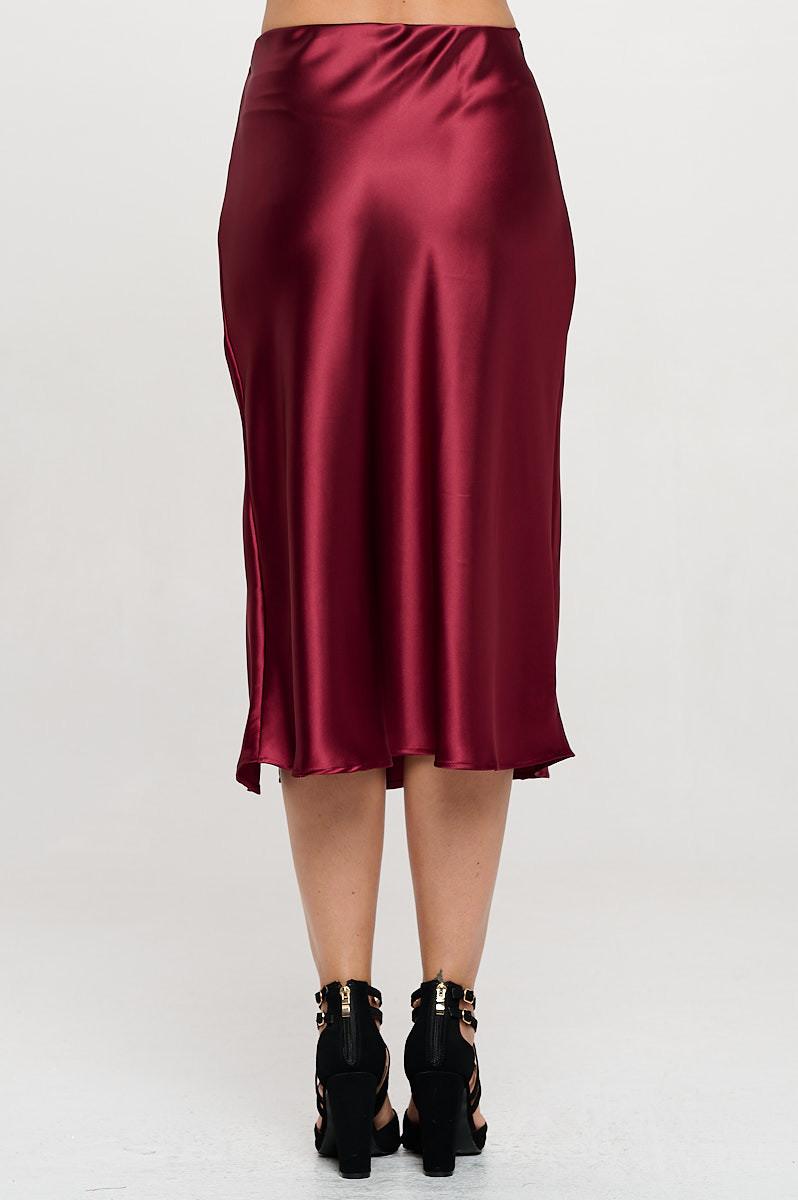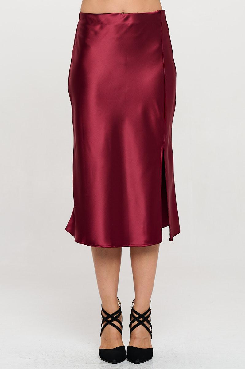 Made in USA Solid Satin Midi Skirt with Slit. Available in other Colors. Fabric content: 97% Polyester, 3% Spandex.