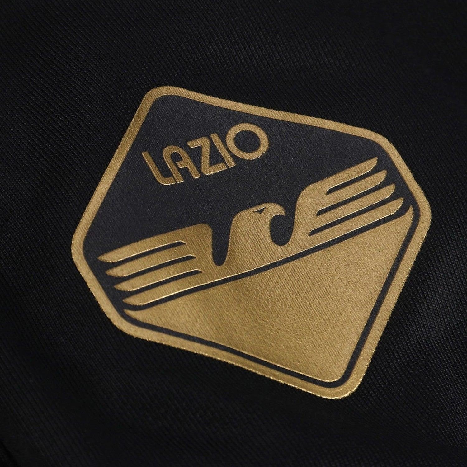 Show your support for the Eagles of Rome! SS Lazio casual fans presentation track set, black version, for 2023/2024 soccer season in Serie A. Designed by japanese technical sponsor Mizuno for the italian Biancocelesti, this elegant cotton tracksuit features black full zip track jacket and matching pants, both with sponsor logo and the iconic, vintage-looking SS Lazio crest in gold.
