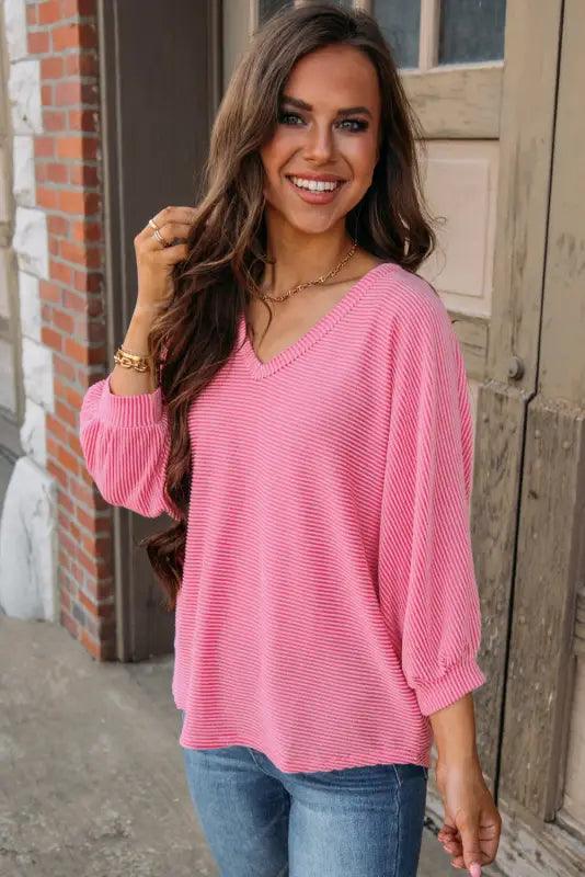 Add a pop of fun to your wardrobe with our Strawberry Pink Striped Top! Featuring a V-neck and bracelet sleeves, this top is perfect for any occasion. Stand out in style and bring a touch of playfulness to your outfit.