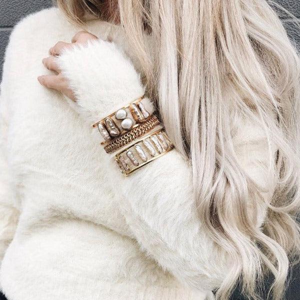 Feel the beautiful feminine energy within with this powerful yet elegant creation. Shakti stands for the procreative power that is responsible for infusing life energy into beings. The SHAKTI Bangle is a bold and divine design handcrafted using precious biwa pearls. These freshwater pearls possess the power to purify your thoughts that impact both mind and body. Experience radiant beauty, enhanced self-awareness and connect to your highest self. Wear one on each wrist to harmonize its effect. Handcrafted with love using sustainable materials and biwa pearl to bring a positive effect on the wearer. Â