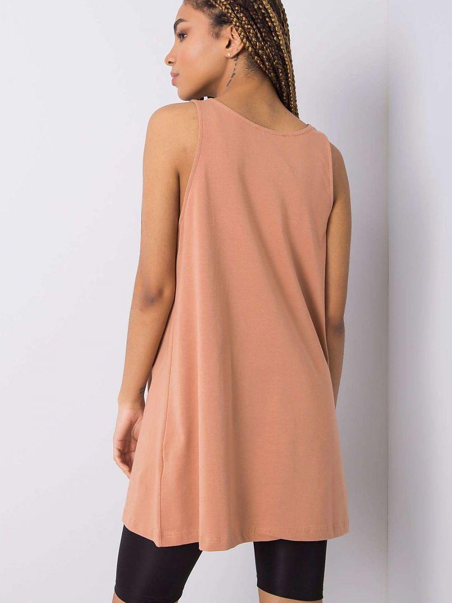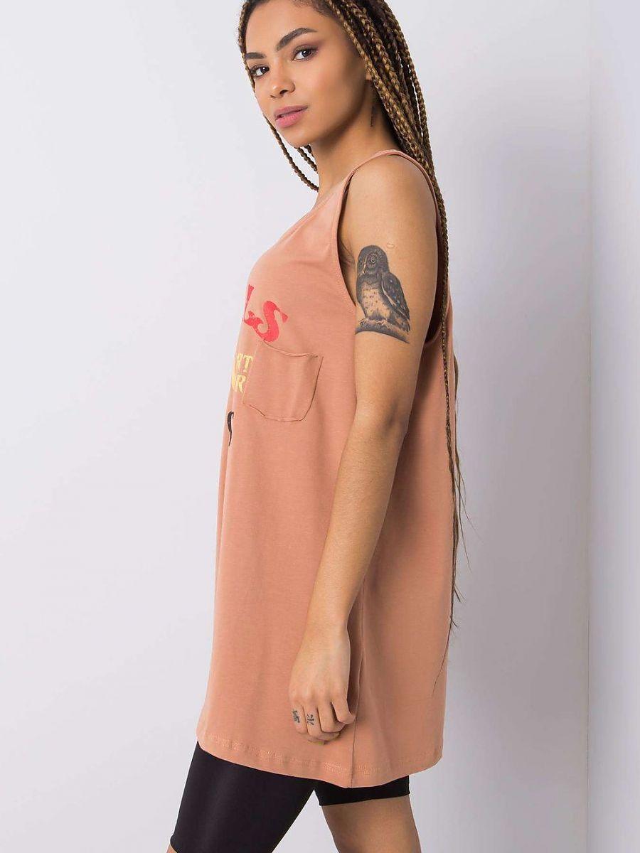T-shirt with an extended cut, sleeveless and round neckline. A decorative inscription on the front.