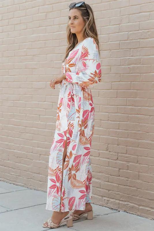 Tropical Plant Print Long Sleeve Wrap V-Neck Slit Maxi Dress