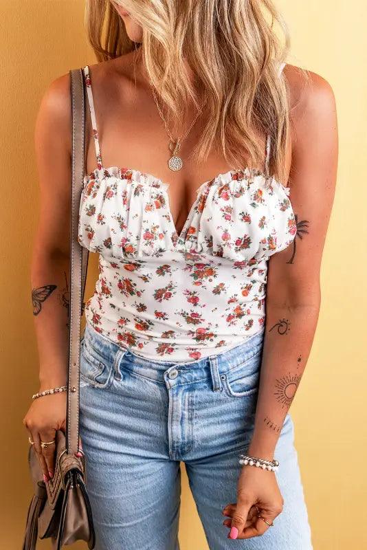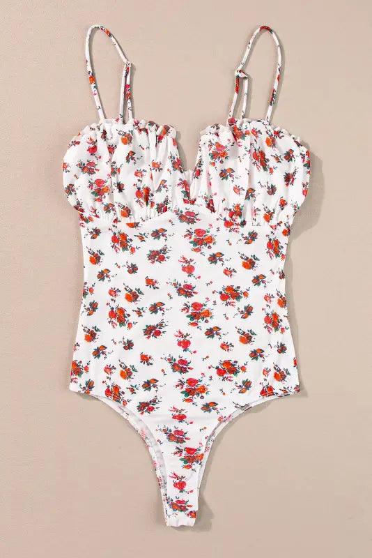 White Floral Bodysuit – V Cut Frilled Trim Spaghetti Straps